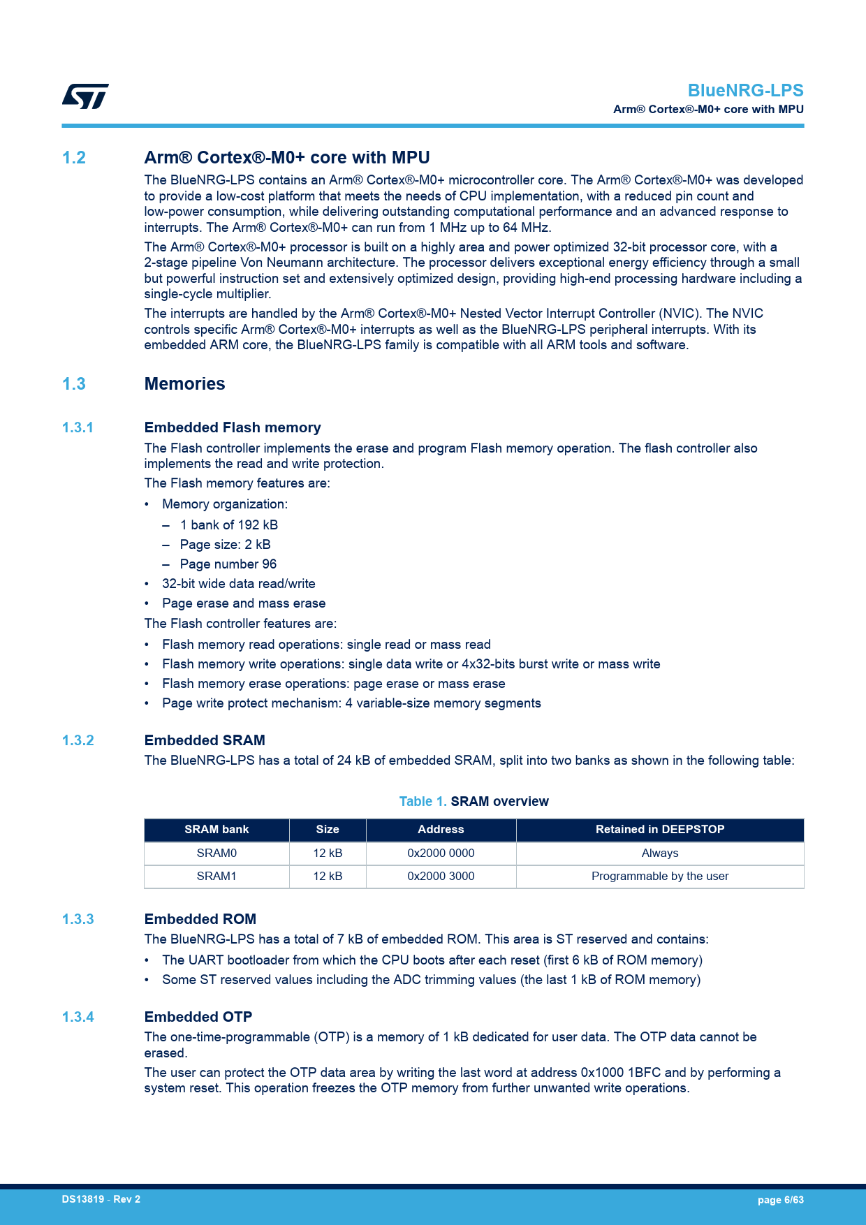 BlueNRG-LPS. Arm® Cortex®-M0+ core with MPU. 1.2. 1.3. Memories. 1.3.1. Embedded Flash memory. 1.3.2. Embedded SRAM