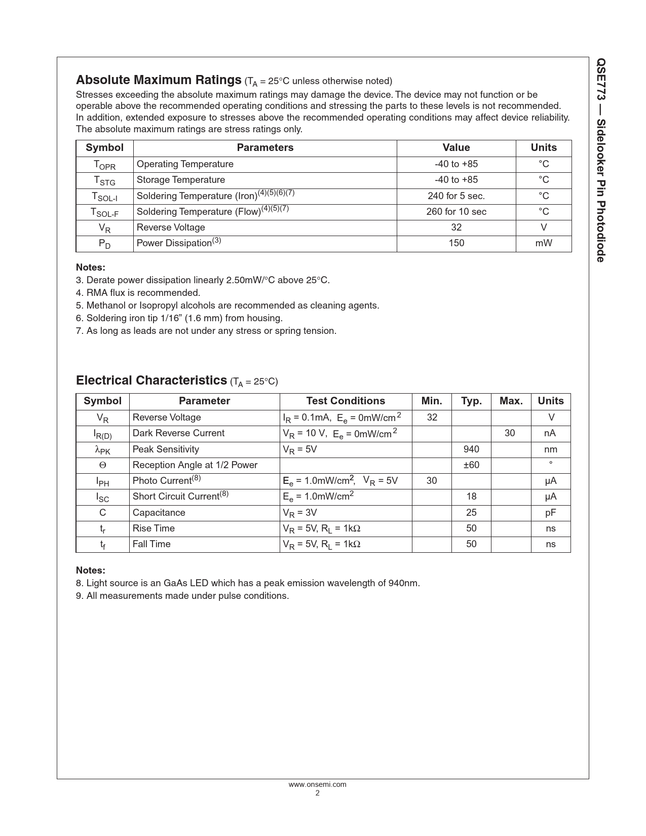 QSE773 — Sidelooker Pin Photodiode. Absolute Maximum Ratings. Symbol. Parameters. Value. Units. Notes:. Electrical Characteristics