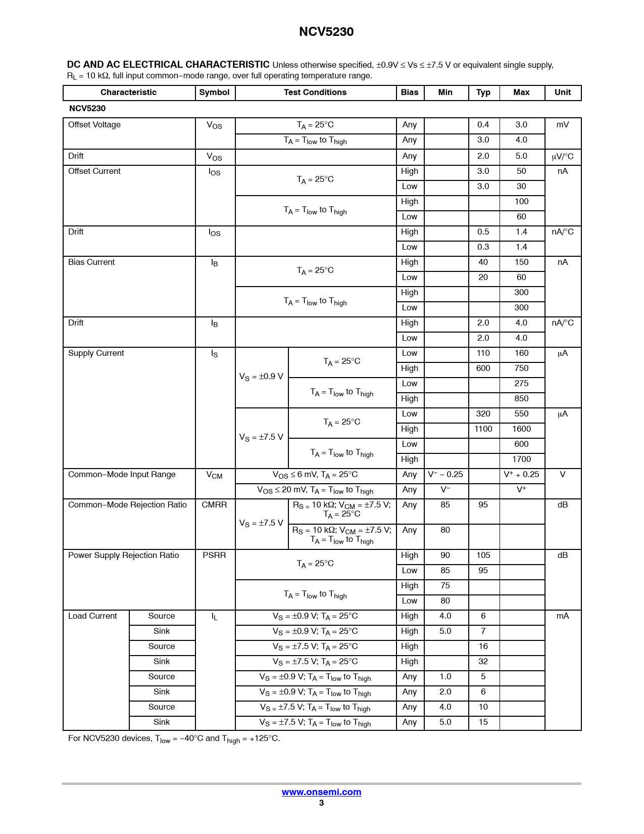Offset Voltage VOS TA = 25°C Any 0.4 3.0 mV TA = Tlow to Thigh Any 3.0 4.0 Drift VOS Any 2.0 5.0 mV/°C Offset Current IOS High 3.0 50 nA TA = 25°C Low 3.0 30 High 100 TA = Tlow to Thigh Low 60 Drift IOS High 0.5 1.4 nA/°C Low 0.3 1.4 Bias Current IB High 40 150 nA TA = 25°C Low 20 60 High 300 TA = Tlow to Thigh Low 300 Drift IB High 2.0 4.0 nA/°C Low 2.0 4.0 Supply Current IS Low 110 160 mA TA = 25°C High 600 750 VS = ±0.9 V Low 275 TA = Tlow to Thigh High 850 Low 320 550 mA TA = 25°C High 1100 1600 VS = ±7.5 V Low 600 TA = Tlow to Thigh High 1700 Common−Mode Input Range VCM VOS ≤ 6 mV, TA = 25°C Any V− − 0.25 V+ + 0.25 V VOS ≤ 20 mV, TA = Tlow to Thigh Any V− V+ Common−Mode Rejection Ratio CMRR RS = 10 kW; VCM = ±7.5 V; Any 85 95 dB TA = 25°C VS = ±7.5 V RS = 10 kW; VCM = ±7.5 V; Any 80 TA = Tlow to Thigh Power Supply Rejection Ratio PSRR High 90 105 dB TA = 25°C Low 85 95 High 75 TA = Tlow to Thigh Low 80 Load Current Source IL VS = ±0.9 V; TA = 25°C High 4.0 6 mA Sink VS = ±0.9 V; TA = 25°C High 5.0 7 Source VS = ±7.5 V; TA = 25°C High 16 Sink VS = ±7.5 V; TA = 25°C High 32 Source VS = ±0.9 V; TA = Tlow to Thigh Any 1.0 5 Sink VS = ±0.9 V; TA = Tlow to Thigh Any 2.0 6 Source VS = ±7.5 V; TA = Tlow to Thigh Any 4.0 10 Sink VS = ±7.5 V; TA = Tlow to Thigh Any 5.0 15 For NCV5230 devices, Tlow = −40°C and Thigh = +125°C.