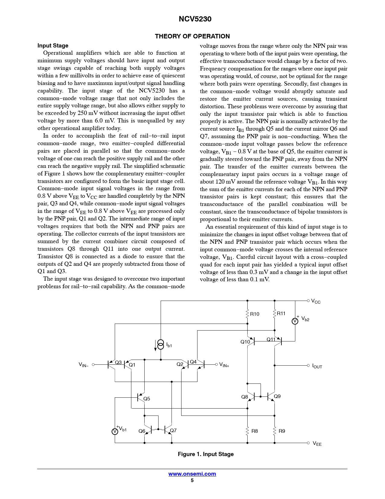 link to page 5 NCV5230THEORY OF OPERATIONInput Stage voltage moves from the range where only the NPN pair was Operational amplifiers which are able to function at operating to where both of the input pairs were operating, the minimum supply voltages should have input and output effective transconductance would change by a factor of two. stage swings capable of reaching both supply voltages Frequency compensation for the ranges where one input pair within a few millivolts in order to achieve ease of quiescent was operating would, of course, not be optimal for the range biasing and to have maximum input/output signal handling where both pairs were operating. Secondly, fast changes in capability. The input stage of the NCV5230 has a the common−mode voltage would abruptly saturate and common−mode voltage range that not only includes the restore the emitter current sources, causing transient entire supply voltage range, but also allows either supply to distortion. These problems were overcome by assuring that be exceeded by 250 mV without increasing the input offset only the input transistor pair which is able to function voltage by more than 6.0 mV. This is unequalled by any properly is active. The NPN pair is normally activated by the other operational amplifier today. current source IB1 through Q5 and the current mirror Q6 and In order to accomplish the feat of rail−to−rail input Q7, assuming the PNP pair is non−conducting. When the common−mode range, two emitter−coupled differential common−mode input voltage passes below the reference pairs are placed in parallel so that the common−mode voltage, VB1 − 0.8 V at the base of Q5, the emitter current is voltage of one can reach the positive supply rail and the other gradually steered toward the PNP pair, away from the NPN can reach the negative supply rail. The simplified schematic pair. The transfer of the emitter currents between the of Figure 1 shows how the complementary emitter−coupler complementary input pairs occurs in a voltage range of transistors are configured to form the basic input stage cell. about 120 mV around the reference voltage VB1. In this way Common−mode input signal voltages in the range from the sum of the emitter currents for each of the NPN and PNP 0.8 V above VEE to VCC are handled completely by the NPN transistor pairs is kept constant; this ensures that the pair, Q3 and Q4, while common−mode input signal voltages transconductance of the parallel combination will be in the range of VEE to 0.8 V above VEE are processed only constant, since the transconductance of bipolar transistors is by the PNP pair, Q1 and Q2. The intermediate range of input proportional to their emitter currents. voltages requires that both the NPN and PNP pairs are An essential requirement of this kind of input stage is to operating. The collector currents of the input transistors are minimize the changes in input offset voltage between that of summed by the current combiner circuit composed of the NPN and PNP transistor pair which occurs when the transistors Q8 through Q11 into one output current. input common−mode voltage crosses the internal reference Transistor Q8 is connected as a diode to ensure that the voltage, VB1. Careful circuit layout with a cross−coupled outputs of Q2 and Q4 are properly subtracted from those of quad for each input pair has yielded a typical input offset Q1 and Q3. voltage of less than 0.3 mV and a change in the input offset The input stage was designed to overcome two important voltage of less than 0.1 mV. problems for rail−to−rail capability. As the common−mode VCC R10 R11 + V Vb2 Q10 Q11 Ib1 Q3 VIN− Q1 Q2 Q4 VIN+ IOUT Q5 Q8 Q9 + V Vb1 Q6 Q7 R8 R9 VEE Figure 1. Input Stagewww.onsemi.com5