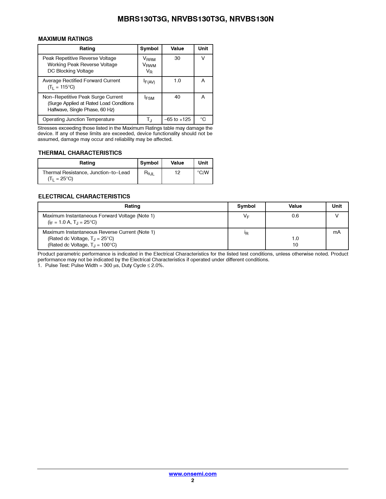 Peak Repetitive Reverse Voltage VRRM 30 V Working Peak Reverse Voltage VRWM DC Blocking Voltage VR Average Rectified Forward Current IF(AV) 1.0 A (TL = 115°C) Non−Repetitive Peak Surge Current IFSM 40 A (Surge Applied at Rated Load Conditions Halfwave, Single Phase, 60 Hz) Operating Junction Temperature TJ −65 to +125 °C Stresses exceeding those listed in the Maximum Ratings table may damage the device. If any of these limits are exceeded, device functionality should not be assumed, damage may occur and reliability may be affected.