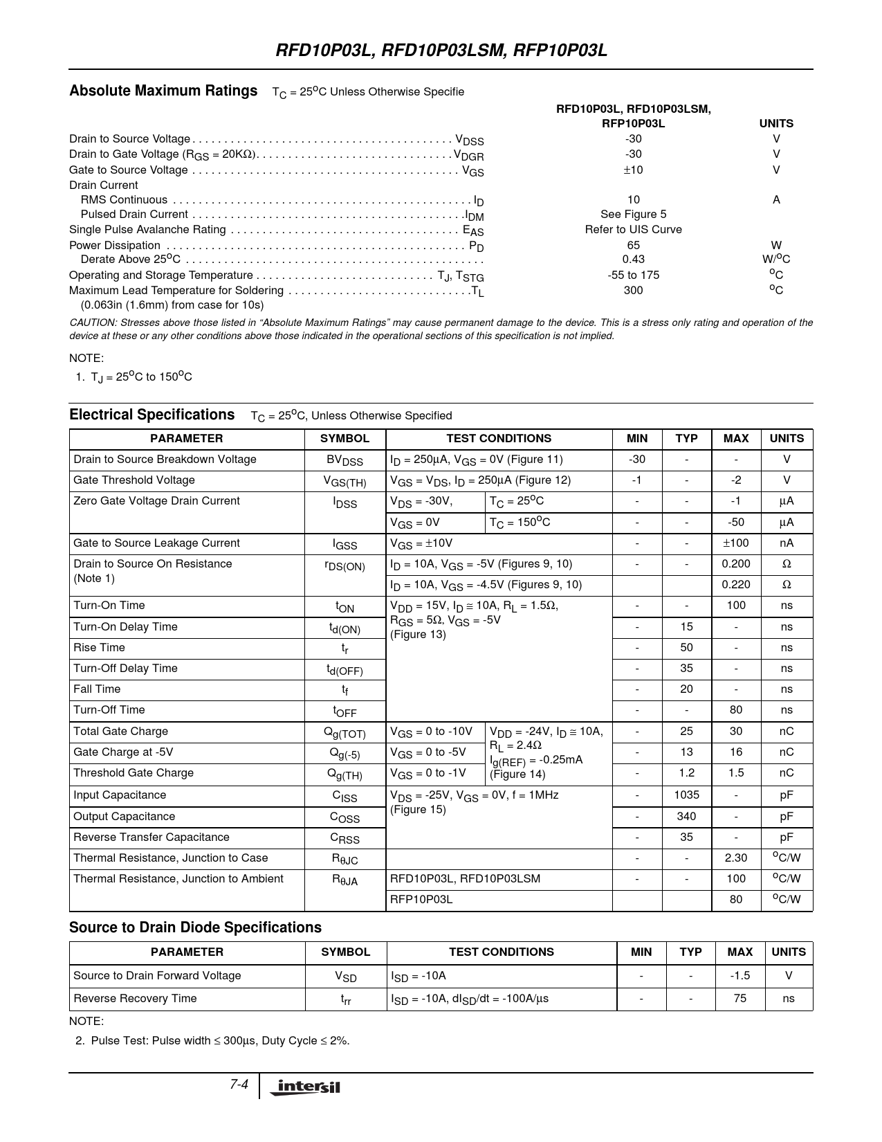RFD10P03L, RFD10P03LSM, RFP10P03L. Absolute Maximum Ratings. RFD10P03L, RFD10P03LSM,. RFP10P03L. UNITS. Electrical Specifications