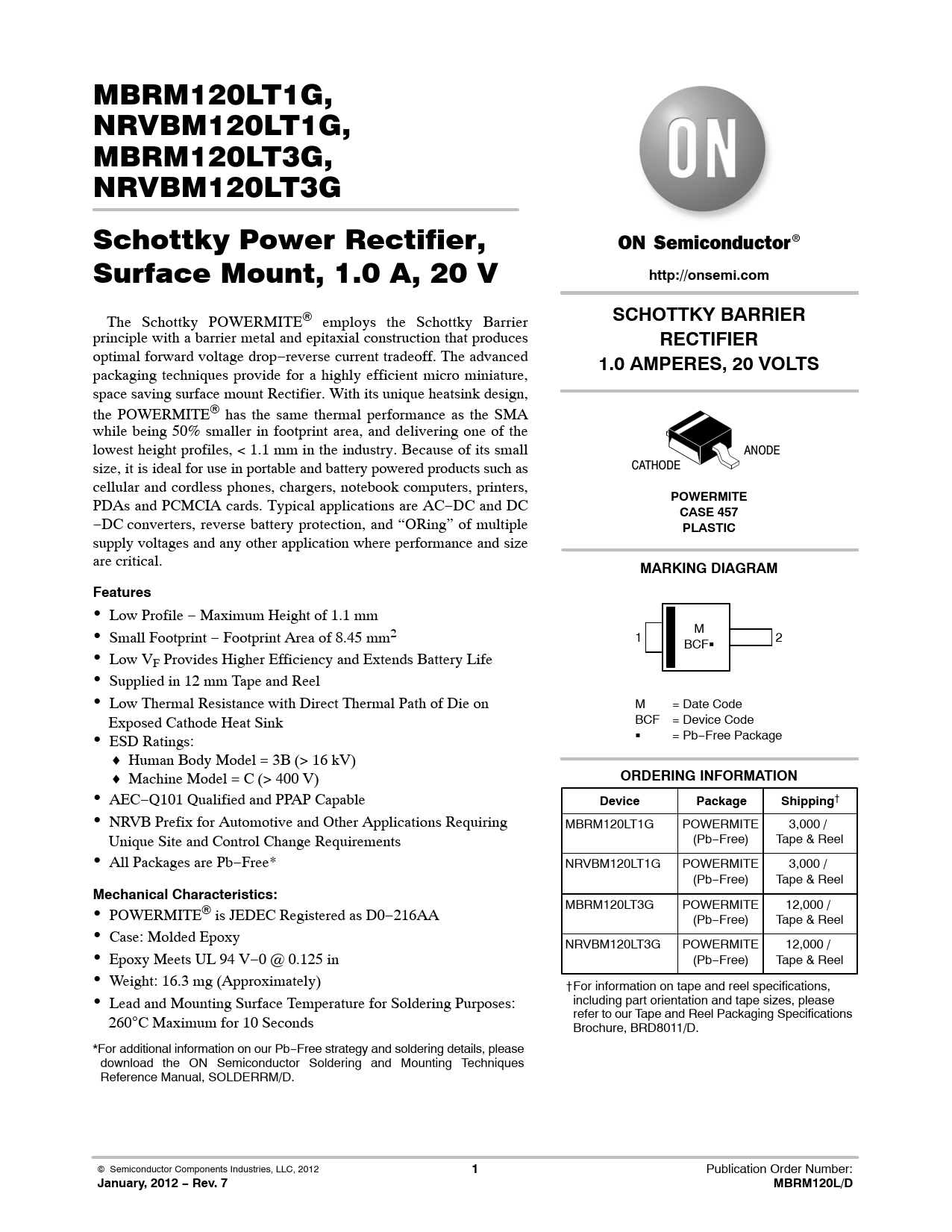Datasheet MBRM120LT1G, NRVBM120LT1G, MBRM120LT3G, NRVBM120LT3G ON Semiconductor, 修订版: 7