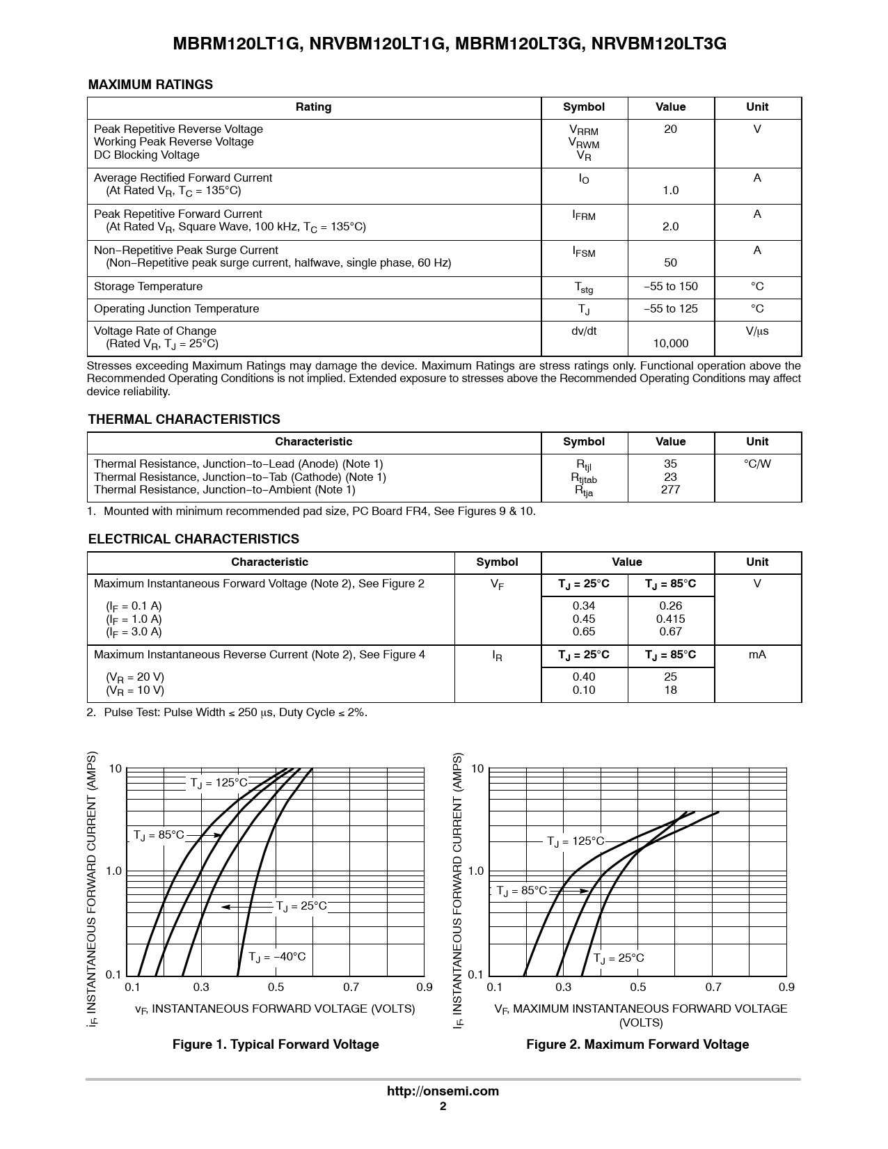 Peak Repetitive Reverse Voltage VRRM 20 V Working Peak Reverse Voltage VRWM DC Blocking Voltage VR Average Rectified Forward Current IO A (At Rated VR, TC = 135C) 1.0 Peak Repetitive Forward Current IFRM A (At Rated VR, Square Wave, 100 kHz, TC = 135C) 2.0 Non−Repetitive Peak Surge Current IFSM A (Non−Repetitive peak surge current, halfwave, single phase, 60 Hz) 50 Storage Temperature Tstg −55 to 150 C Operating Junction Temperature TJ −55 to 125 C Voltage Rate of Change dv/dt V/ms (Rated VR, TJ = 25C) 10,000 Stresses exceeding Maximum Ratings may damage the device. Maximum Ratings are stress ratings only. Functional operation above the Recommended Operating Conditions is not implied. Extended exposure to stresses above the Recommended Operating Conditions may affect device reliability.