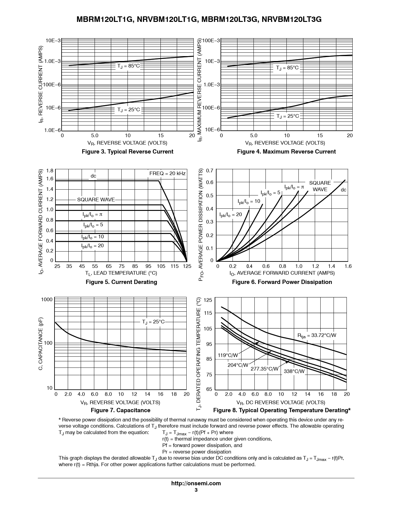 MBRM120LT1G, NRVBM120LT1G, MBRM120LT3G, NRVBM120LT3G 10E−3 100E−3 1.0E−3 10E−3 TJ = 85C TJ = 85C 100E−6 1.0E−3 10E−6 100E−6 TJ = 25C , REVERSE CURRENT (AMPS) TJ = 25C I R 1.0E−6 10E−6 0 5.0 10 15 20 , MAXIMUM REVERSE CURRENT (AMPS) 0 5.0 10 15 20 I R VR, REVERSE VOLTAGE (VOLTS) VR, REVERSE VOLTAGE (VOLTS) Figure 3. Typical Reverse CurrentFigure 4. Maximum Reverse Current 1.8 0.7 FREQ = 20 kHz 1.6 dc ATTS) 0.6 SQUARE 1.4 Ipk/Io = p WAVE I dc pk/Io = 5 0.5 1.2 SQUARE WAVE ATION (W Ipk/Io = 10 1.0 0.4 Ipk/Io = p Ipk/Io = 20 0.8 ARD CURRENT (AMPS) 0.3 I W pk/Io = 5 0.6 I 0.2 pk/Io = 10 0.4 Ipk/Io = 20 0.2 0.1 VERAGE FOR 0 0 VERAGE POWER DISSIP , A 25 35 45 55 65 75 85 95 105 115 125 0 0.2 0.4 0.6 0.8 1.0 1.2 1.4 1.6 , A I O TL, LEAD TEMPERATURE (C) IO, AVERAGE FORWARD CURRENT (AMPS) P FO Figure 5. Current DeratingFigure 6. Forward Power Dissipation 1000 125 C) 115 TURE ( TJ = 25C 105 Rtja = 33.72C/W ANCE (pF) 100 95 ACIT TING TEMPERA 119C/W 85 204 C, CAP C/W 277.35C/W 338 75 C/W 10 TED OPERA 65 0 2.0 4.0 6.0 8.0 10 12 14 16 18 20 0 2.0 4.0 6.0 8.0 10 12 14 16 18 20 VR, REVERSE VOLTAGE (VOLTS) , DERA VR, DC REVERSE VOLTAGE (VOLTS) Figure 7. Capacitance T J Figure 8. Typical Operating Temperature Derating* * Reverse power dissipation and the possibility of thermal runaway must be considered when operating this device under any re- verse voltage conditions. Calculations of TJ therefore must include forward and reverse power effects. The allowable operating TJ may be calculated from the equation: TJ = TJmax − r(t)(Pf + Pr) where r(t) = thermal impedance under given conditions, Pf = forward power dissipation, and Pr = reverse power dissipation This graph displays the derated allowable TJ due to reverse bias under DC conditions only and is calculated as TJ = TJmax − r(t)Pr, where r(t) = Rthja. For other power applications further calculations must be performed. http://onsemi.com3