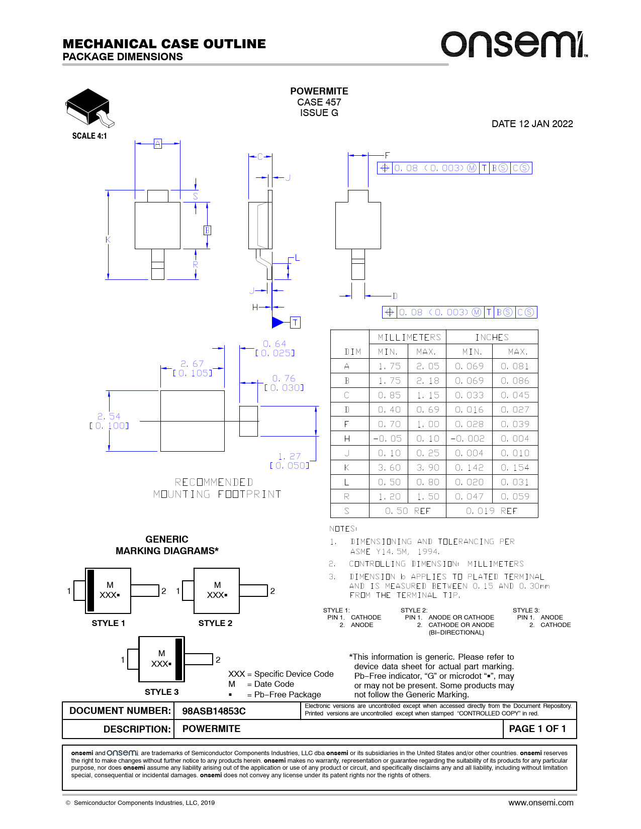 PACKAGE DIMENSIONS. POWERMITE. SCALE 4:1. GENERIC. MARKING DIAGRAMS*. STYLE 1. STYLE 2. STYLE 3. DOCUMENT NUMBER: 98ASB14853C