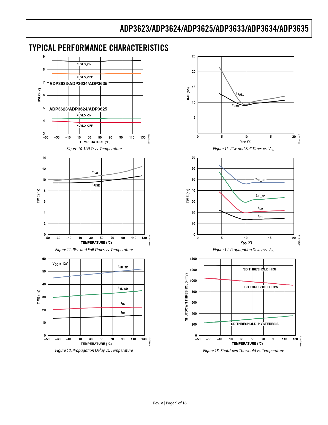 ADP3623/ADP3624/ADP3625/ADP3633/ADP3634/ADP3635TYPICAL PERFORMANCE CHARACTERISTICS925VUVLO_ON820VUVLO_OFF7ADP3633/ADP3634/ADP3635) 15s(V) Ot6FALLVLIME (nUT 10tRISE5ADP3623/ADP3624/ADP3625VUVLO_ON54VUVLO_OFF30–50–30–101030507090110130 022 05101520 012 TEMPERATURE (°C)VDD (V) 08132- 08132- Figure 10. UVLO vs. Temperature Figure 13. Rise and Fall Times vs. VDD 14701260tFALL1050tdH_SDtRISE))s8s 40tdL_SDIME (nIME (nT6T 30tD2420tD121000–50–30–101030507090110130 010 05101520 013 TEMPERATURE (°C)VDD (V) 08132- 08132- Figure 11. Rise and Fall Times vs. Temperature Figure 14. Propagation Delay vs. VDD 601400VDD = 12VtdH_SD1200SD THRESHOLD HIGH50)mV 1000D (40LtSD THRESHOLD LOW)dL_SDHOsS80030HREIME (n Tt600D2N T W20tDOD1400HUT S10200SD THRESHOLD HYSTERESIS00–50–30–101030507090110130 011 –50–30–101030507090110130 014 TEMPERATURE (°C)TEMPERATURE (°C) 08132- 08132- Figure 12. Propagation Delay vs. Temperature Figure 15. Shutdown Threshold vs. Temperature Rev. A | Page 9 of 16 Document Outline Features Applications General Description Functional Block Diagram Revision History Specifications Timing Diagrams Absolute Maximum Ratings ESD Caution Pin Configuration and Function Descriptions Typical Performance Characteristics Test Circuit Theory of Operation Input Drive Requirements (INA, AA, INB, AA, and SD) Low-Side Drivers (OUTA, OUTB) Shutdown (SD) Function Overtemperature Protections Supply Capacitor Selection PCB Layout Considerations Parallel Operation Thermal Considerations Design Example Outline Dimensions Ordering Guide