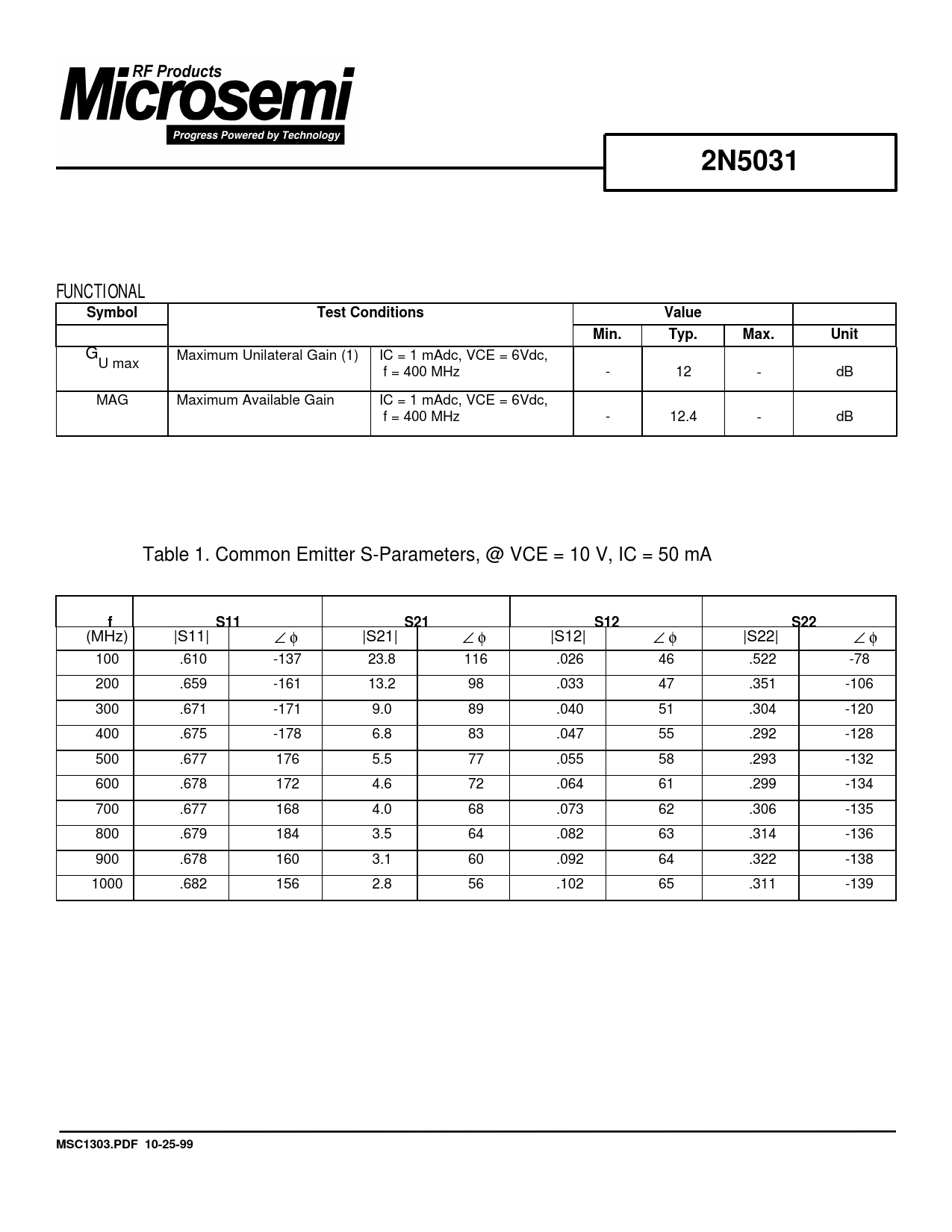 2N5031. Symbol. Test Conditions. Value. Min. Typ. Max. Unit. S11. S21. S12. S22. MSC1303.PDF 10-25-99