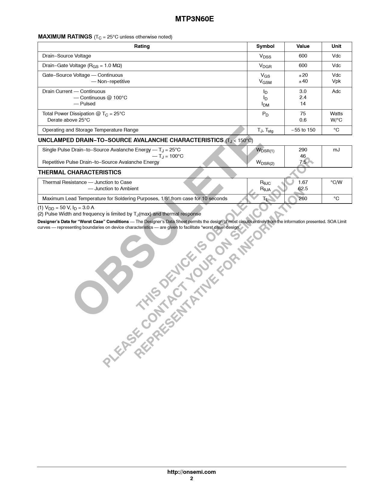 MTP3N60EMAXIMUM RATINGS (TC = 25°C unless otherwise noted) RatingSymbolValueUnit Drain−Source Voltage VDSS 600 Vdc Drain−Gate Voltage (RGS = 1.0 MΩ) VDGR 600 Vdc Gate−Source Voltage — Continuous VGS ± 20 Vdc Gate−Source Voltage — Non−repetitive VGSM ± 40 Vpk Drain Current — Continuous ID 3.0 Adc Drain Current — Continuous @ 100°C ID 2.4 Drain Current — Pulsed IDM 14 Total Power Dissipation @ TC = 25°C PD 75 Watts Derate above 25°C 0.6 W/°C Operating and Storage Temperature Range TJ, Tstg −55 to 150 °C UNCLAMPED DRAIN−TO−SOURCE AVALANCHE CHARACTERISTICS (TJ < 150°C) Single Pulse Drain−to−Source Avalanche Energy — TJ = 25°C WDSR(1) 290 mJ Single Pulse Drain−to−Source Avalanche Energy — TJ = 100°C 46 Repetitive Pulse Drain−to−Source Avalanche Energy WDSR(2) 7.5 THERMAL CHARACTERISTICS Thermal Resistance — Junction to Case° RθJC 1.67 °C/W Thermal Resistance — Junction to Ambient° RθJA 62.5 Maximum Lead Temperature for Soldering Purposes, 1/8″ from case for 10 seconds TL 260 °C (1) VDD = 50 V, ID = 3.0 A (2) Pulse Width and frequency is limited by TJ(max) and thermal response Designer’s Data for “Worst Case” Conditions — The Designer’s Data Sheet permits the design of most circuits entirely from the information presented. SOA Limit curves — representing boundaries on device characteristics — are given to facilitate “worst case” design. http://onsemi.com2
