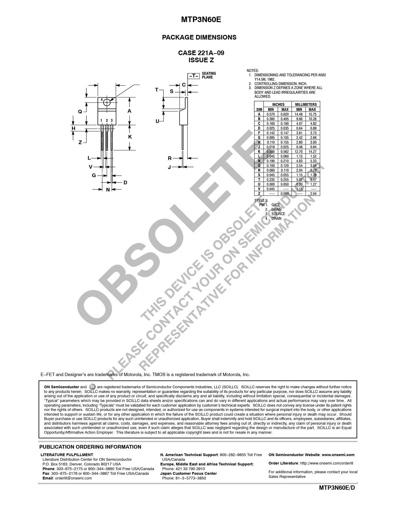 MTP3N60EPACKAGE DIMENSIONSCASE 221A−09ISSUE Z NOTES: SEATING 1. DIMENSIONING AND TOLERANCING PER ANSI −T− PLANE Y14.5M, 1982. 2. CONTROLLING DIMENSION: INCH. C 3. DIMENSION Z DEFINES A ZONE WHERE ALL TS BODY AND LEAD IRREGULARITIES ARE ALLOWED. 4 INCHES MILLIMETERS DIM MIN MAX MIN MAX QA A 0.570 0.620 14.48 15.75 B 0.380 0.405 9.66 10.28 1 2 3 U C 0.160 0.190 4.07 4.82 H D 0.025 0.035 0.64 0.88 F 0.142 0.147 3.61 3.73 K G 0.095 0.105 2.42 2.66 Z H 0.110 0.155 2.80 3.93 J 0.018 0.025 0.46 0.64 K 0.500 0.562 12.70 14.27 L 0.045 0.060 1.15 1.52 LR N 0.190 0.210 4.83 5.33 Q 0.100 0.120 2.54 3.04 VJ R 0.080 0.110 2.04 2.79 G S 0.045 0.055 1.15 1.39 T 0.235 0.255 5.97 6.47 D U 0.000 0.050 0.00 1.27 N V 0.045 −−− 1.15 −−− Z −−− 0.080 −−− 2.04 STYLE 5: PIN 1. GATE 2. DRAIN 3. SOURCE 4. DRAIN E−FET and Designer’s are trademarks of Motorola, Inc. TMOS is a registered trademark of Motorola, Inc. ON Semiconductor and are registered trademarks of Semiconductor Components Industries, LLC (SCILLC). SCILLC reserves the right to make changes without further notice to any products herein. SCILLC makes no warranty, representation or guarantee regarding the suitability of its products for any particular purpose, nor does SCILLC assume any liability arising out of the application or use of any product or circuit, and specifically disclaims any and all liability, including without limitation special, consequential or incidental damages. “Typical” parameters which may be provided in SCILLC data sheets and/or specifications can and do vary in different applications and actual performance may vary over time. All operating parameters, including “Typicals” must be validated for each customer application by customer’s technical experts. SCILLC does not convey any license under its patent rights nor the rights of others. SCILLC products are not designed, intended, or authorized for use as components in systems intended for surgical implant into the body, or other applications intended to support or sustain life, or for any other application in which the failure of the SCILLC product could create a situation where personal injury or death may occur. Should Buyer purchase or use SCILLC products for any such unintended or unauthorized application, Buyer shall indemnify and hold SCILLC and its officers, employees, subsidiaries, affiliates, and distributors harmless against all claims, costs, damages, and expenses, and reasonable attorney fees arising out of, directly or indirectly, any claim of personal injury or death associated with such unintended or unauthorized use, even if such claim alleges that SCILLC was negligent regarding the design or manufacture of the part. SCILLC is an Equal Opportunity/Affirmative Action Employer. This literature is subject to all applicable copyright laws and is not for resale in any manner. PUBLICATION ORDERING INFORMATIONLITERATURE FULFILLMENT : N. American Technical Support : 800−282−9855 Toll Free ON Semiconductor Website : www.onsemi.com Literature Distribution Center for ON Semiconductor USA/Canada P.O. Box 5163, Denver, Colorado 80217 USA Europe, Middle East and Africa Technical Support:Order Literature : http://www.onsemi.com/orderlit Phone : 303−675−2175 or 800−344−3860 Toll Free USA/Canada Phone: 421 33 790 2910 Fax : 303−675−2176 or 800−344−3867 Toll Free USA/Canada Japan Customer Focus Center For additional information, please contact your local Email : orderlit@onsemi.com Phone: 81−3−5773−3850 Sales Representative http://onsemi.comMTP3N60E/D8