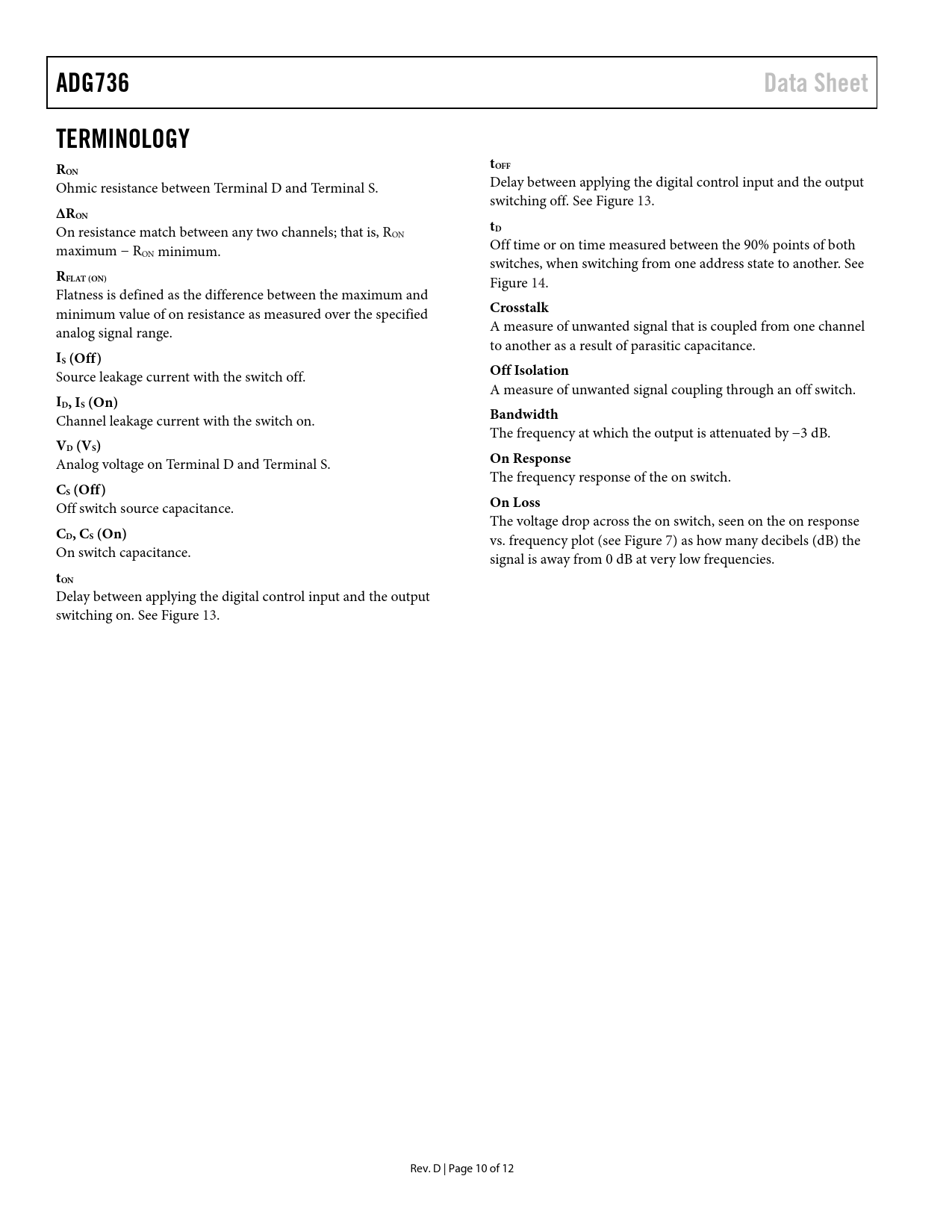 link to page 9 link to page 9 link to page 9 link to page 8 ADG736Data SheetTERMINOLOGY RtOFFON Ohmic resistance between Terminal D and Terminal S. Delay between applying the digital control input and the output switching off. See Figure 13. ∆RON On resistance match between any two channels; that is, R tD ON maximum − R Off time or on time measured between the 90% points of both ON minimum. switches, when switching from one address state to another. See RFLAT (ON) Figure 14. Flatness is defined as the difference between the maximum and minimum value of on resistance as measured over the specified Crosstalk analog signal range. A measure of unwanted signal that is coupled from one channel to another as a result of parasitic capacitance. IS (Off) Source leakage current with the switch off. Off Isolation A measure of unwanted signal coupling through an off switch. ID, IS (On) Channel leakage current with the switch on. Bandwidth The frequency at which the output is attenuated by −3 dB. VD (VS) Analog voltage on Terminal D and Terminal S. On Response The frequency response of the on switch. CS (Off) Off switch source capacitance. On Loss The voltage drop across the on switch, seen on the on response CD, CS (On) vs. frequency plot (see Figure 7) as how many decibels (dB) the On switch capacitance. signal is away from 0 dB at very low frequencies. tON Delay between applying the digital control input and the output switching on. See Figure 13. Rev. D | Page 10 of 12 Document Outline Features Applications Functional Block Diagram General Description Product Highlights Revision History Specifications Absolute Maximum Ratings ESD Caution Pin Configuration and Function Descriptions Typical Performance Characteristics Test Circuits Terminology Applications Information Outline Dimensions Ordering Guide Automotive Products