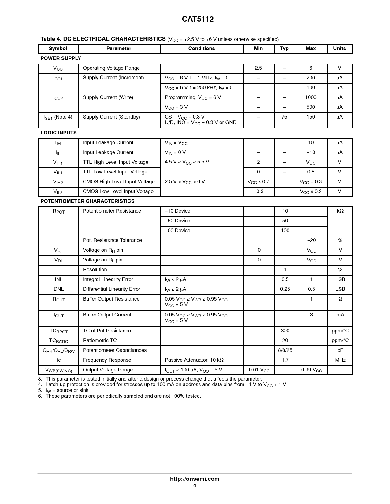 CAT5112. Table 4. DC ELECTRICAL CHARACTERISTICS. Symbol. Parameter. Conditions. Min. Typ. Max. Units. POWER SUPPLY. LOGIC INPUTS