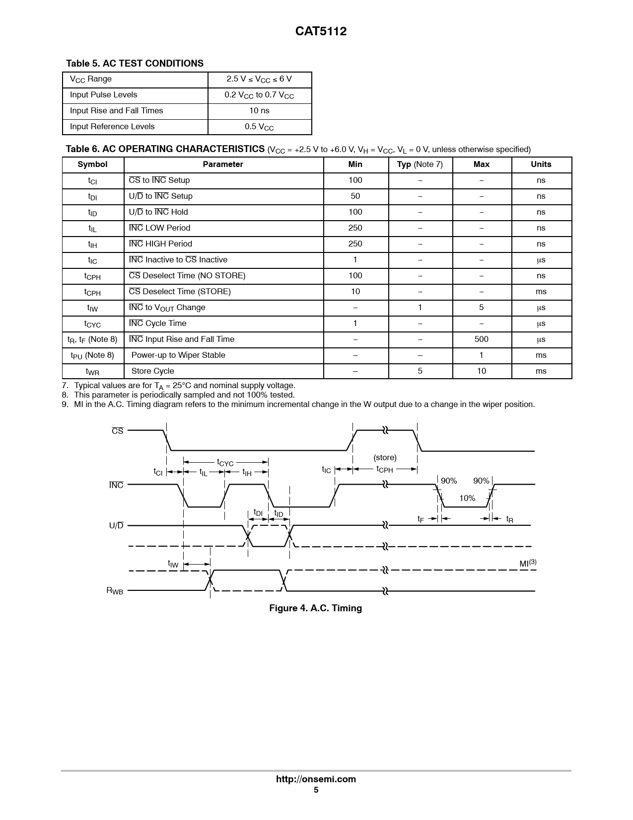 tCI CS to INC Setup 100 − − ns tDI U/D to INC Setup 50 − − ns tID U/D to INC Hold 100 − − ns tIL INC LOW Period 250 − − ns tIH INC HIGH Period 250 − − ns tIC INC Inactive to CS Inactive 1 − − ms tCPH CS Deselect Time (NO STORE) 100 − − ns tCPH CS Deselect Time (STORE) 10 − − ms tIW INC to VOUT Change − 1 5 ms tCYC INC Cycle Time 1 − − ms tR, tF (Note 8) INC Input Rise and Fall Time − − 500 ms tPU (Note 8) Power-up to Wiper Stable – – 1 ms tWR Store Cycle – 5 10 ms 7. Typical values are for TA = 25C and nominal supply voltage. 8. This parameter is periodically sampled and not 100% tested. 9. MI in the A.C. Timing diagram refers to the minimum incremental change in the W output due to a change in the wiper position. CS (store) tCYC t t t IC tCPH CI IL tIH 90% 90% INC 10% tDI tID tF tR U/D tIW MI(3) RWB