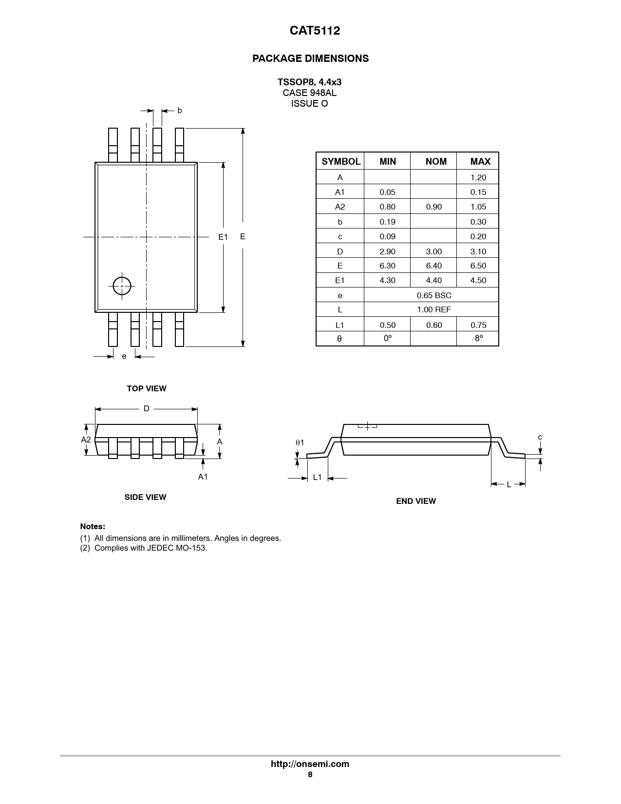 CAT5112. PACKAGE DIMENSIONS. TSSOP8, 4.4x3. SYMBOL. MIN. NOM. MAX. TOP VIEW. SIDE VIEW. END VIEW. Notes:. http://onsemi.com