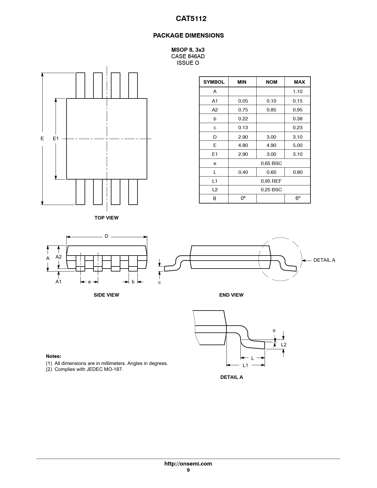 CAT5112. PACKAGE DIMENSIONS. MSOP 8, 3x3. SYMBOL. MIN. NOM. MAX. TOP VIEW. SIDE VIEW. END VIEW. Notes:. DETAIL A. http://onsemi.com