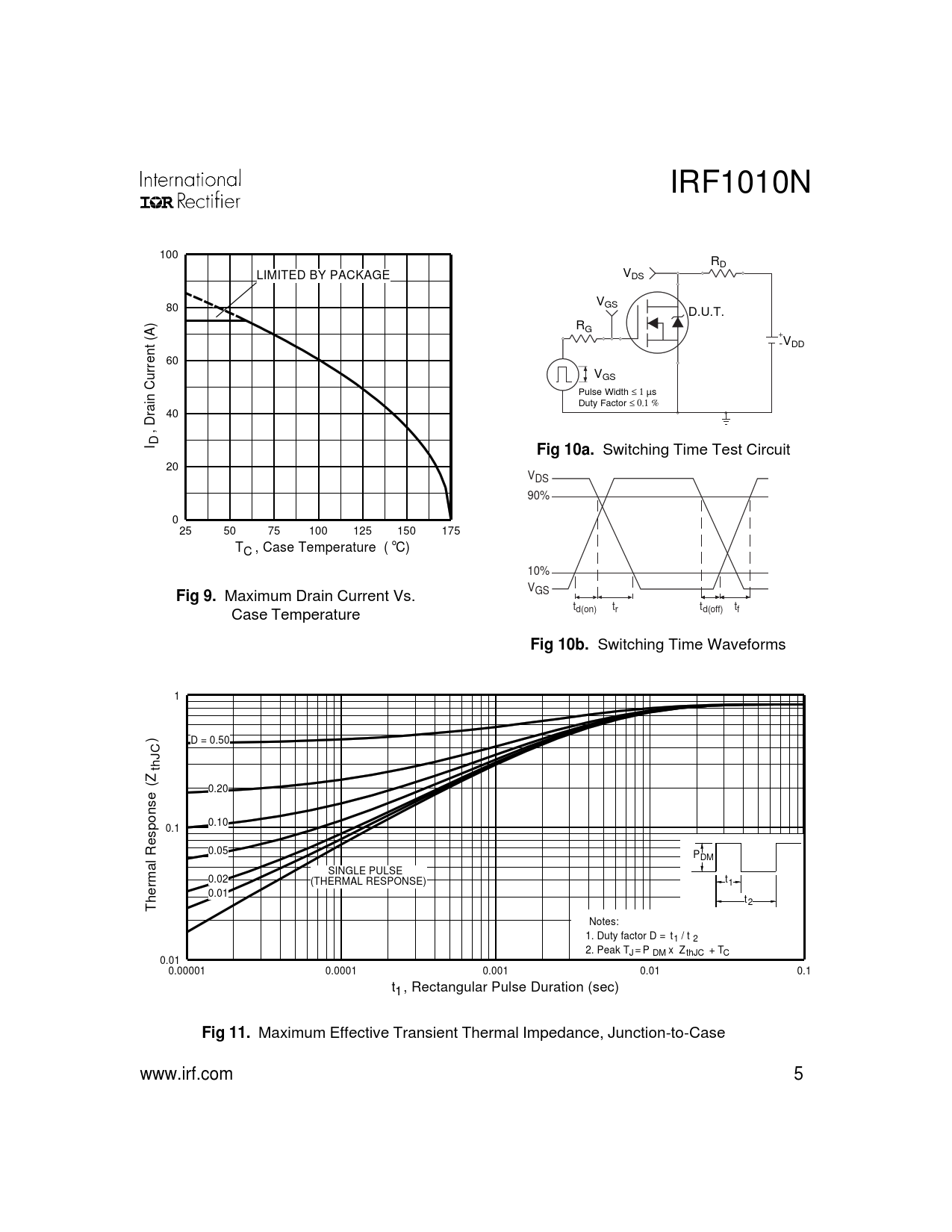 IRF1010N 100 RD V LIMITED BY PACKAGE DS VGS 80 D.U.T. RG + -VDD 60 VGS Pulse Width ≤ 1 µs Duty Factor ≤ 0.1 % 40 I , Drain Current (A) D Fig 10a. Switching Time Test Circuit 20 VDS 90% 0 25 50 75 100 125 150 175 T , Case Temperature ( C) ° C 10% V Fig 9. Maximum Drain Current Vs. GS t Case Temperature d(on) tr td(off) tf Fig 10b. Switching Time Waveforms 1 D = 0.50 thJC (Z ) 0.20 0.10 0.1 0.05 0.02 SINGLE PULSE (THERMAL RESPONSE) 0.01 Thermal Response PDM t1 t 2 Notes: 1. Duty factor D = t / t 1 2 2. Peak T = P x Z + T J DM thJC C 0.01 0.00001 0.0001 0.001 0.01 0.1 t , Rectangular Pulse Duration (sec) 1 Fig 11. Maximum Effective Transient Thermal Impedance, Junction-to-Case www.irf.com 5