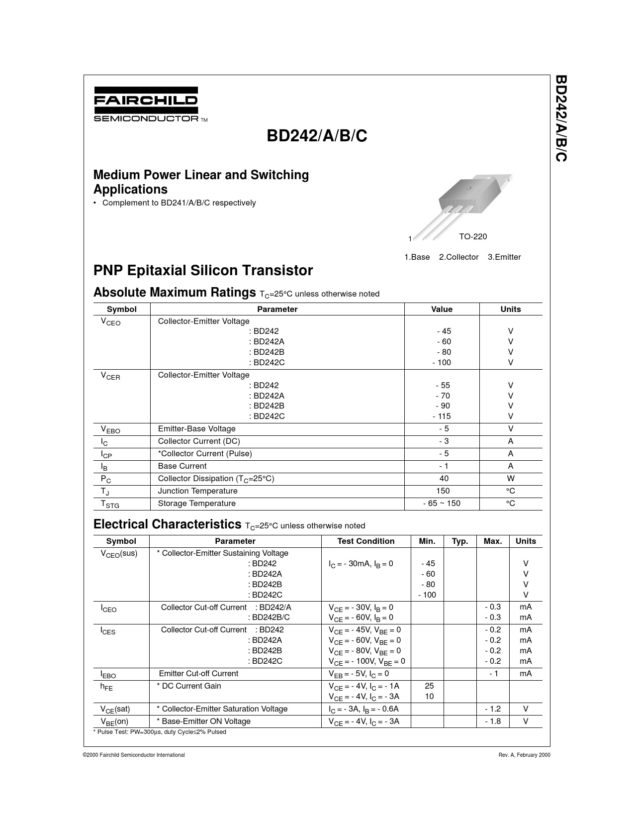 BD242/. A/B/. BD242/A/B/C. Medium Power Linear and Switching Applications. PNP Epitaxial Silicon Transistor