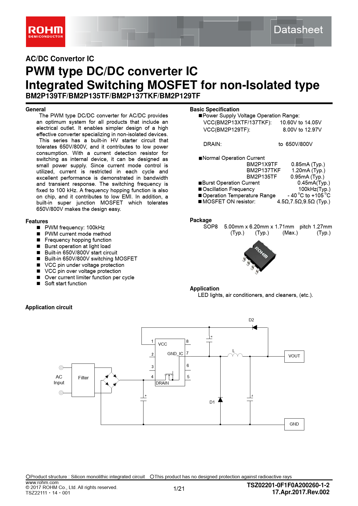 D2 1 8 VCC L 2 GND_IC 7 VOUT 3 6 AC 4 5 Filter Input DRAIN D1 GND ○Product structure : Silicon monolithic integrated circuit ○This product has no designed protection against radioactive rays . www.rohm.com © 2017 ROHM Co., Ltd. All rights reserved. 1/21