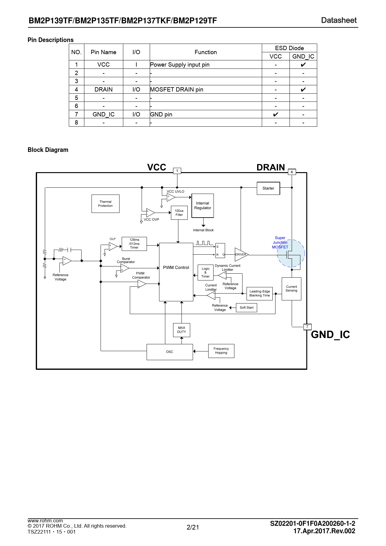 BM2P139TF/BM2P135TF/BM2P137TKF/BM2P129TF. Pin Descriptions. Block Diagram. SZ02201-0F1F0A200260-1-2. 17.Apr.2017.Rev.002