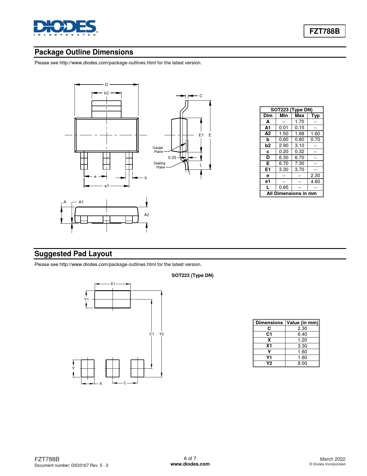 FZT788B. Package Outline Dimensions. SOT223 (Type DN). Dim. Min. Max. Typ. All Dimensions in mm. Suggested Pad Layout