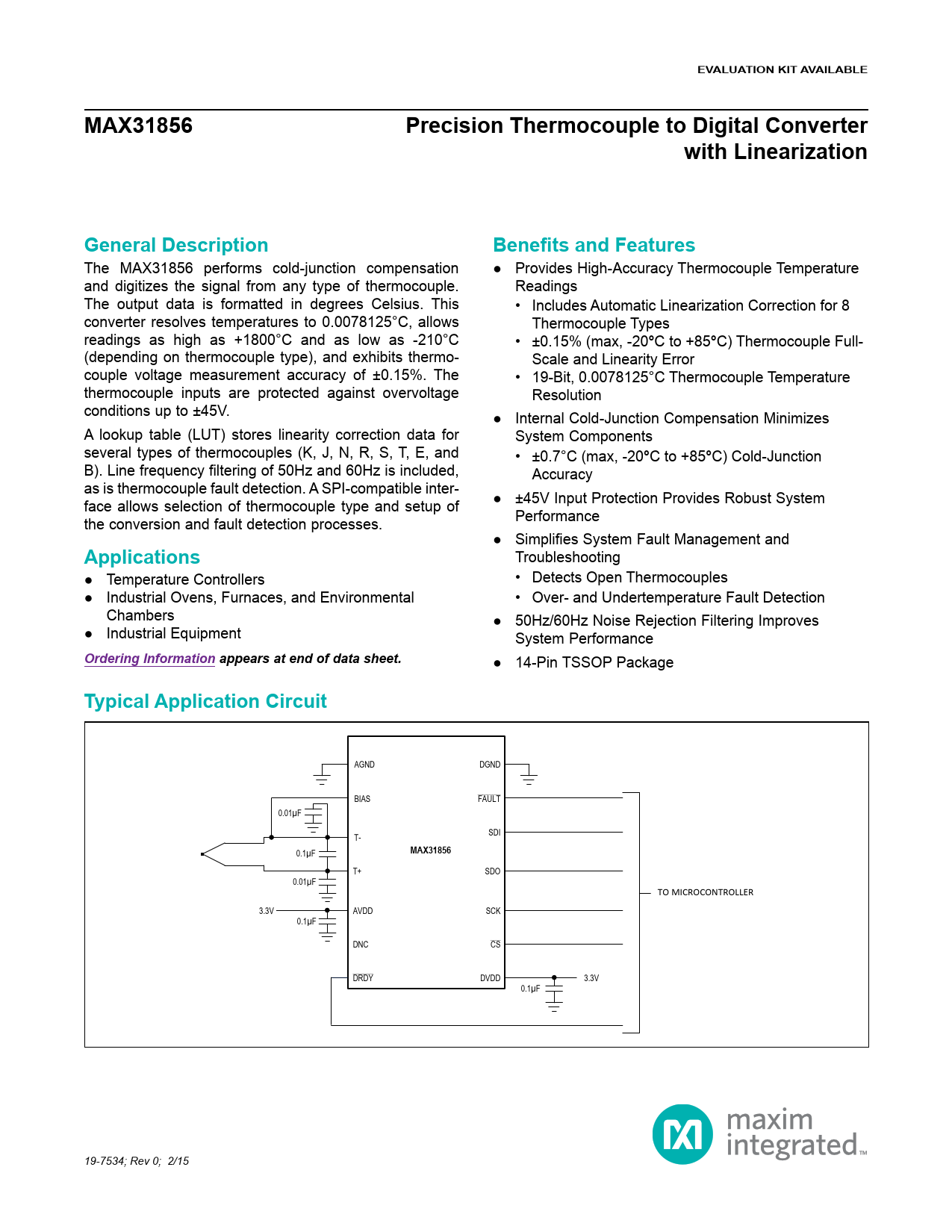 link to page 29 EVALUATION KIT AVAILABLEMAX31856Precision Thermocouple to Digital Converterwith LinearizationGeneral DescriptionBenefits and Features The MAX31856 performs cold-junction compensation ● Provides High-Accuracy Thermocouple Temperature and digitizes the signal from any type of thermocouple. Readings The output data is formatted in degrees Celsius. This • Includes Automatic Linearization Correction for 8 converter resolves temperatures to 0.0078125°C, allows Thermocouple Types readings as high as +1800°C and as low as -210°C • ±0.15% (max, -20 ° C to +85 ° C) Thermocouple Full- (depending on thermocouple type), and exhibits thermo- Scale and Linearity Error couple voltage measurement accuracy of ±0.15%. The • 19-Bit, 0.0078125°C Thermocouple Temperature thermocouple inputs are protected against overvoltage Resolution conditions up to ±45V. ● Internal Cold-Junction Compensation Minimizes A lookup table (LUT) stores linearity correction data for System Components several types of thermocouples (K, J, N, R, S, T, E, and • ±0.7°C (max, -20 ° C to +85 ° C) Cold-Junction B). Line frequency filtering of 50Hz and 60Hz is included, Accuracy as is thermocouple fault detection. A SPI-compatible inter- face allows selection of thermocouple type and setup of ● ±45V Input Protection Provides Robust System the conversion and fault detection processes. Performance ● Simplifies System Fault Management and Applications Troubleshooting ● Temperature Controllers • Detects Open Thermocouples ● Industrial Ovens, Furnaces, and Environmental • Over- and Undertemperature Fault Detection Chambers ● 50Hz/60Hz Noise Rejection Filtering Improves ● Industrial Equipment System Performance Ordering Information appears at end of data sheet. ● 14-Pin TSSOP Package Typical Application Circuit AGND DGND BIAS FAULT 0.01µF SDI T- 0.1µF MAX31856 T+ SDO 0.01µF TO MICROCONTROLLER 3.3V AVDD SCK 0.1µF DNC CS DRDY DVDD 3.3V 0.1µF 19-7534; Rev 0; 2/15