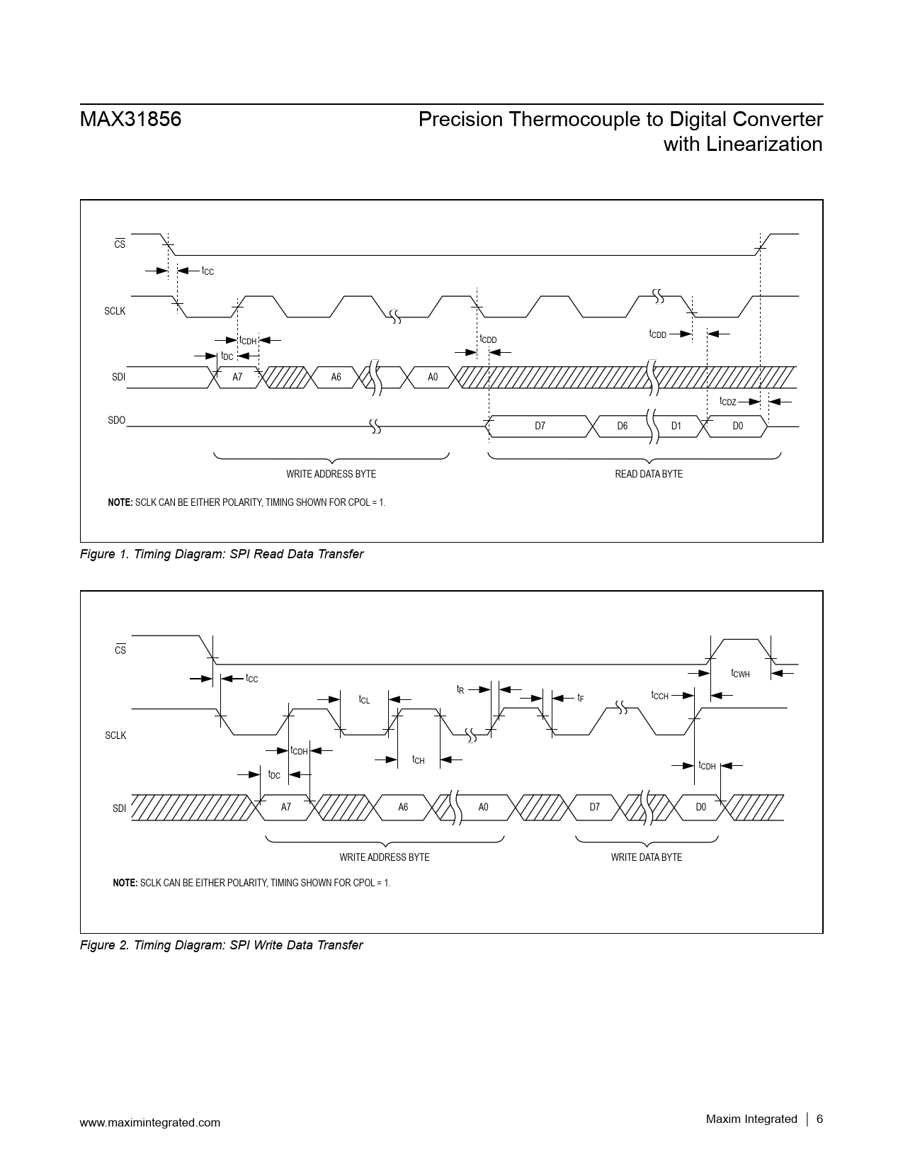 MAX31856 Precision Thermocouple to Digital Converter with Linearization CS tCC SCLK t tCDD CDH tCDD tDC SDI A7 A6 A0 tCDZ SDO D7 D6 D1 D0 WRITE ADDRESS BYTE READ DATA BYTE NOTE: SCLK CAN BE EITHER POLARITY, TIMING SHOWN FOR CPOL = 1. Figure 1. Timing Diagram: SPI Read Data Transfer CS t t CC CWH tR tCL tF tCCH SCLK tCDH tCH tCDH tDC SDI A7 A6 A0 D7 D0 WRITE ADDRESS BYTE WRITE DATA BYTE NOTE: SCLK CAN BE EITHER POLARITY, TIMING SHOWN FOR CPOL = 1. Figure 2. Timing Diagram: SPI Write Data Transfer www.maximintegrated.com Maxim Integrated │ 6