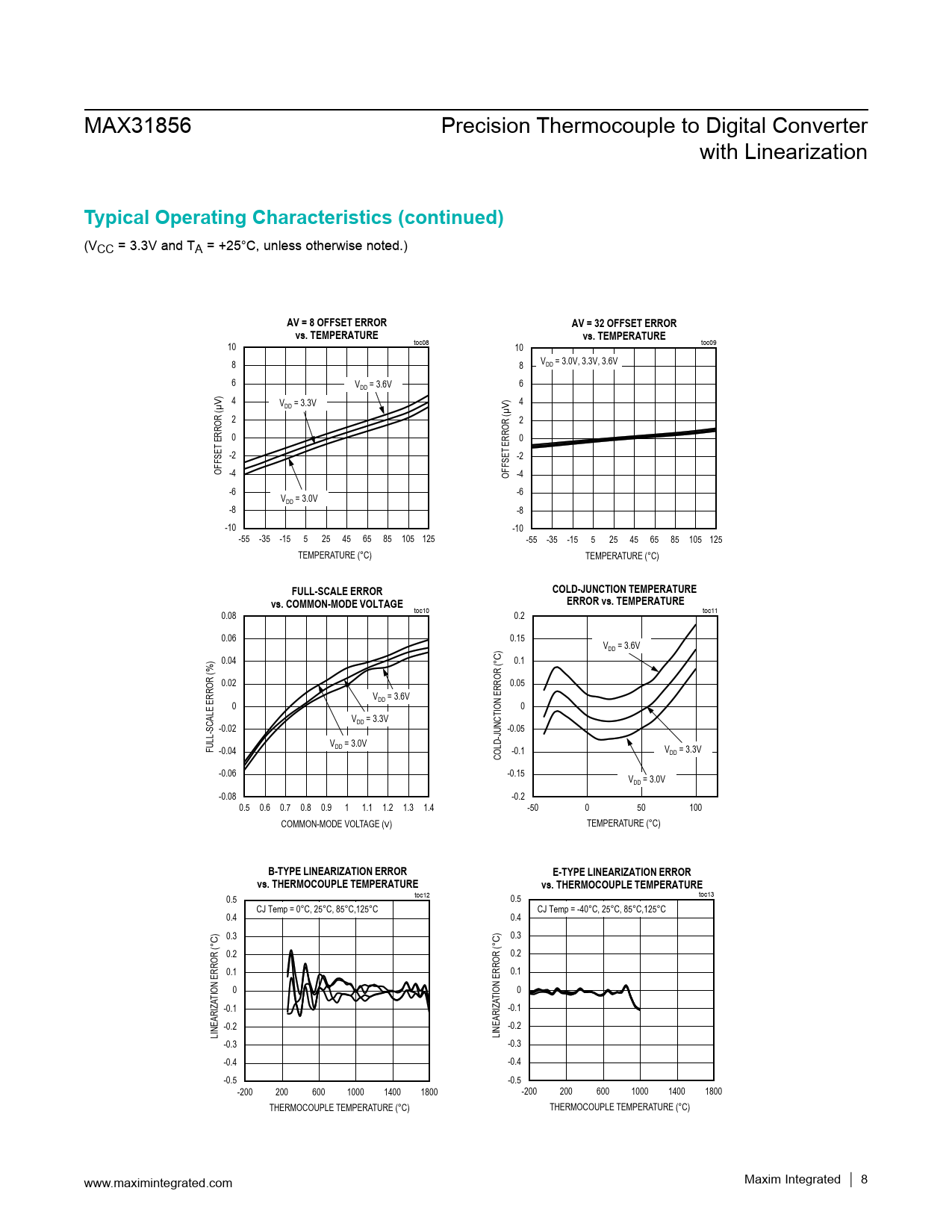 0.5 toc12 0.5 toc13 CJ Temp = 0°C, 25°C, 85°C,125°C CJ Temp = -40°C, 25°C, 85°C,125°C 0.4 0.4 ) 0.3 ) 0.3 (°C (°C R 0.2 R 0.2 RRO 0.1 RRO 0.1 N E N E 0 0 ZATIO -0.1 ZATIO -0.1 ARI ARI -0.2 -0.2 LINE LINE -0.3 -0.3 -0.4 -0.4 -0.5 -0.5 -200 200 600 1000 1400 1800 -200 200 600 1000 1400 1800 THERMOCOUPLE TEMPERATURE (°C) THERMOCOUPLE TEMPERATURE (°C) www.maximintegrated.com Maxim Integrated │ 8
