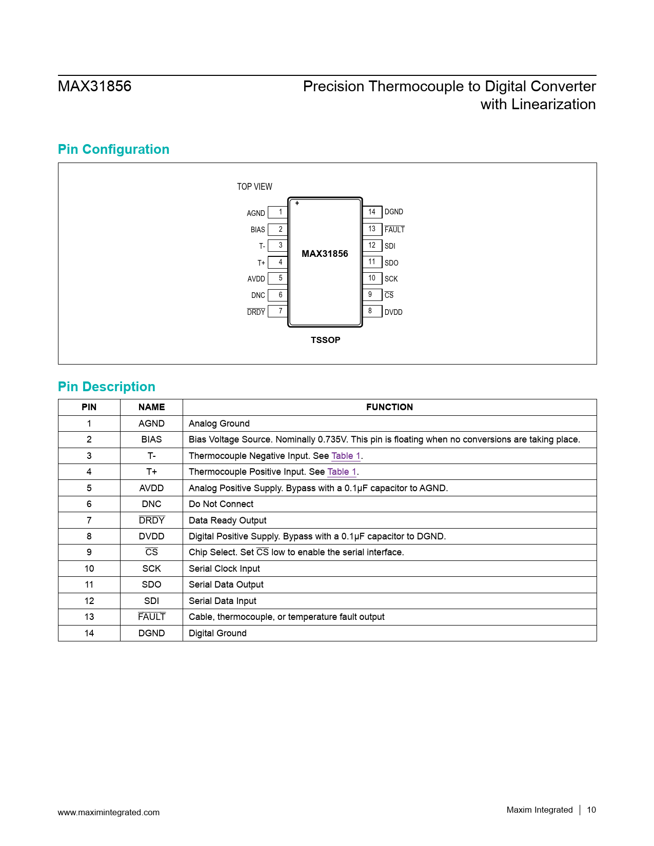 页数 / 页30 / 10 — Pin Configuration. MAX31856. TSSOP. Pin Description. PIN. NAME. FUNCTION