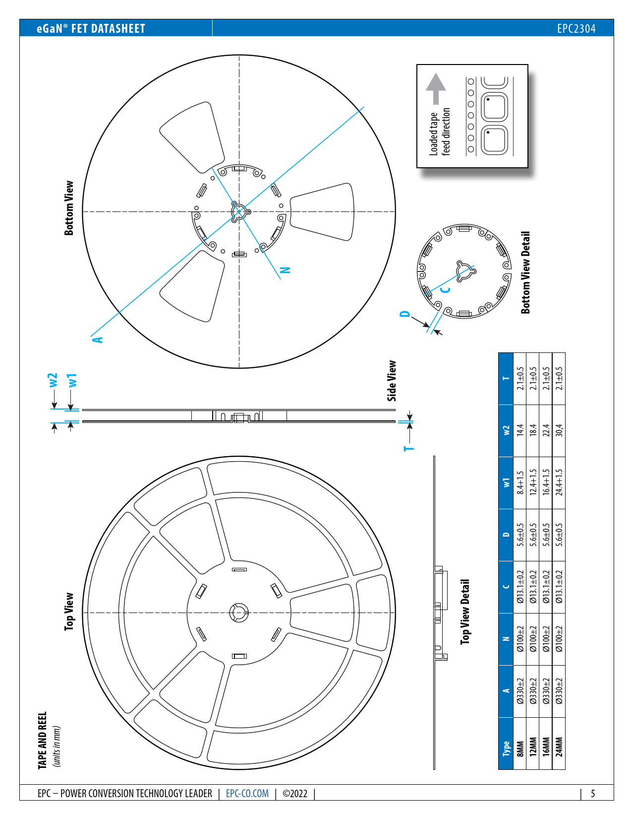 eGaN® FET DATASHEET. w ie om V Bott. Detail. w ie. om V. Bott. Side V. Top V. Type. 8MM. 12MM. 16MM. 24MM. TAPE AND REEL
