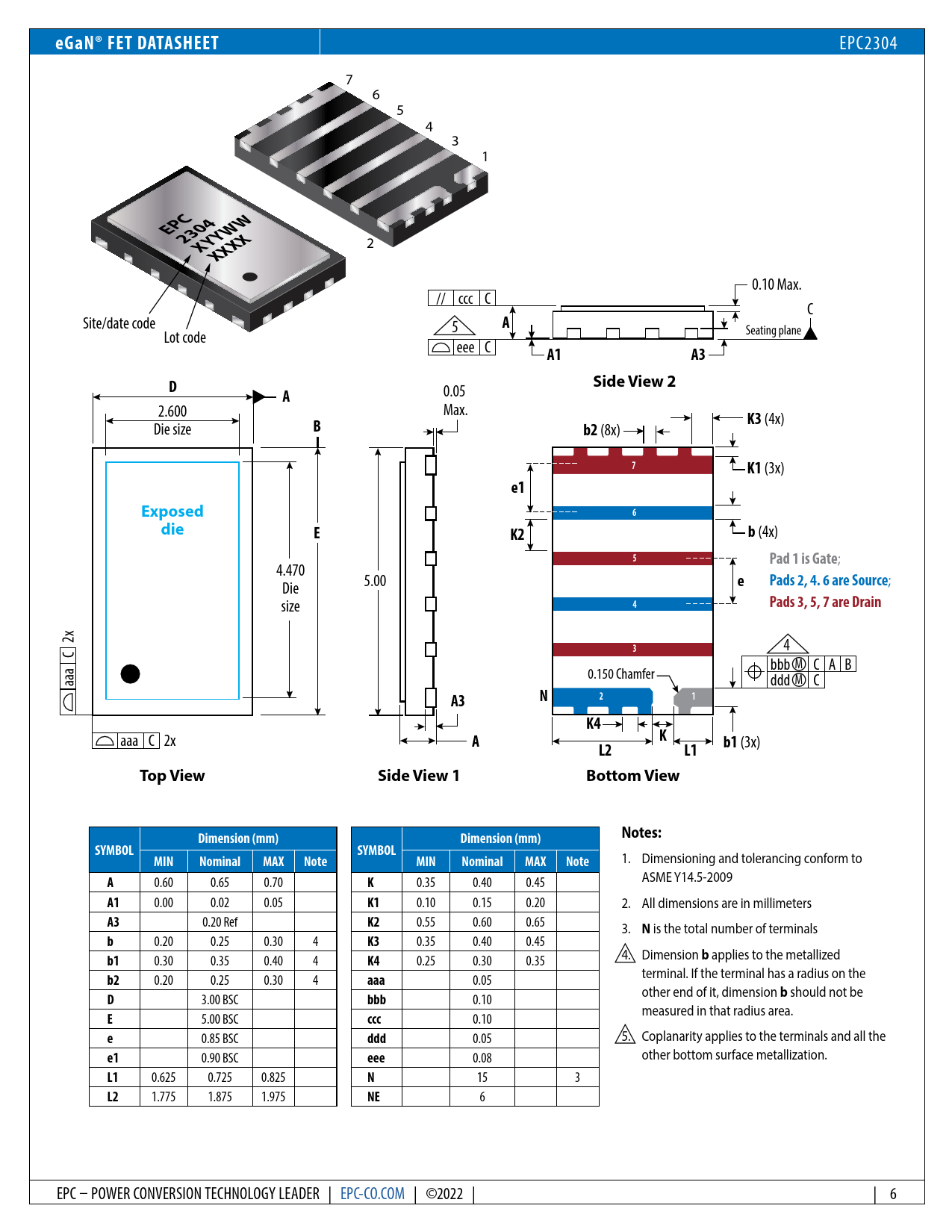 eGaN® FET DATASHEET. EPC2301. EPC XY. 2304YWW. XYYW. XXXX. XXX. Side View 2. Exposed. die. Pad 1 is Gate. Pads 2, 4. 6 are Source