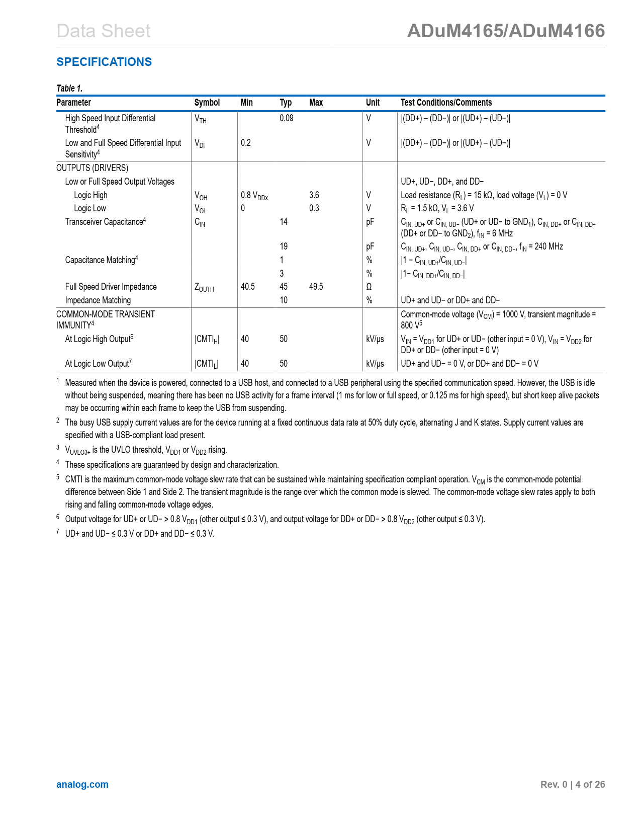 页数 / 页26 / 4 — ADuM4165/ADuM4166. SPECIFICATIONS. Table 1. Parameter. Symbol. Min. Typ. …