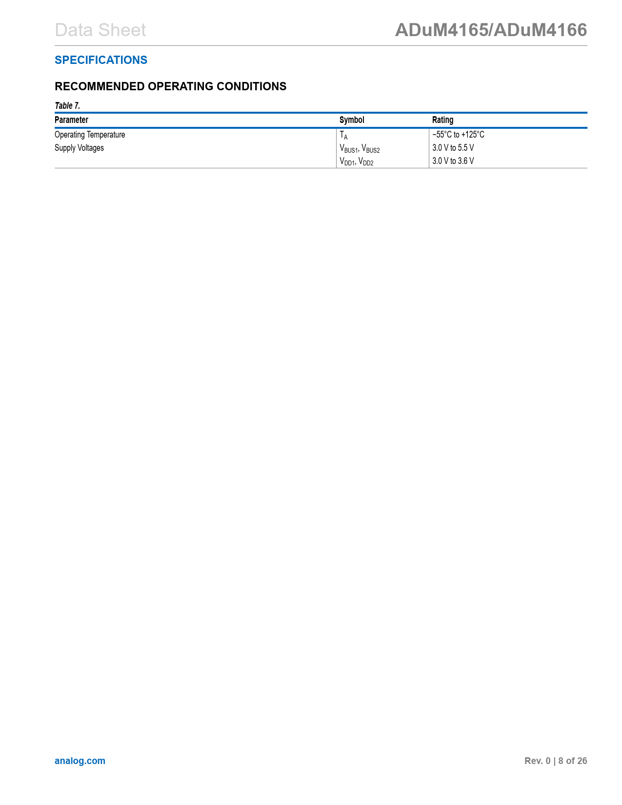 Data Sheet ADuM4165/ADuM4166SPECIFICATIONSRECOMMENDED OPERATING CONDITIONSTable 7.ParameterSymbolRating Operating Temperature TA −55°C to +125°C Supply Voltages VBUS1, VBUS2 3.0 V to 5.5 V VDD1, VDD2 3.0 V to 3.6 V analog.comRev. 0 | 8 of 26 Document Outline Features Applications Functional Block Diagrams General Description Specifications Timing Specifications Insulation and Safety Related Specifications Package Characteristics Regulatory Information DIN V VDE V 0884-11 (VDE V 0884-11) Insulation Characteristics (Pending) Recommended Operating Conditions Absolute Maximum Ratings Thermal Resistance Electrostatic Discharge (ESD) Ratings ESD Ratings for ADuM4165/ADuM4166 ESD Caution Pin Configurations and Function Descriptions Truth Tables Typical Performance Characteristics Terminology Bus Upstream and Downstream Hub Host Peripheral Enumeration Low Speed Full Speed High Speed End of Packet (EOP) J State K State SE0 State SE1 State Idle L1 Suspend L2 Suspend Theory of Operation Automatic Data Transfer and Modes Retimer and Other Features Isolator Characteristics and Low Power Modes Applications Information Power Supply Options Clock Options PGOOD, Clock, and Power Sequencing Isolated USB Implementations Peripheral Applications Host Applications Interface Applications PCB Layout and Electromagnetic Interference (EMI) Insulation Lifetime Surface Tracking Insulation Wear Out Calculation and Use of Parameters Example Outline Dimensions Ordering Guide Evaluation Boards