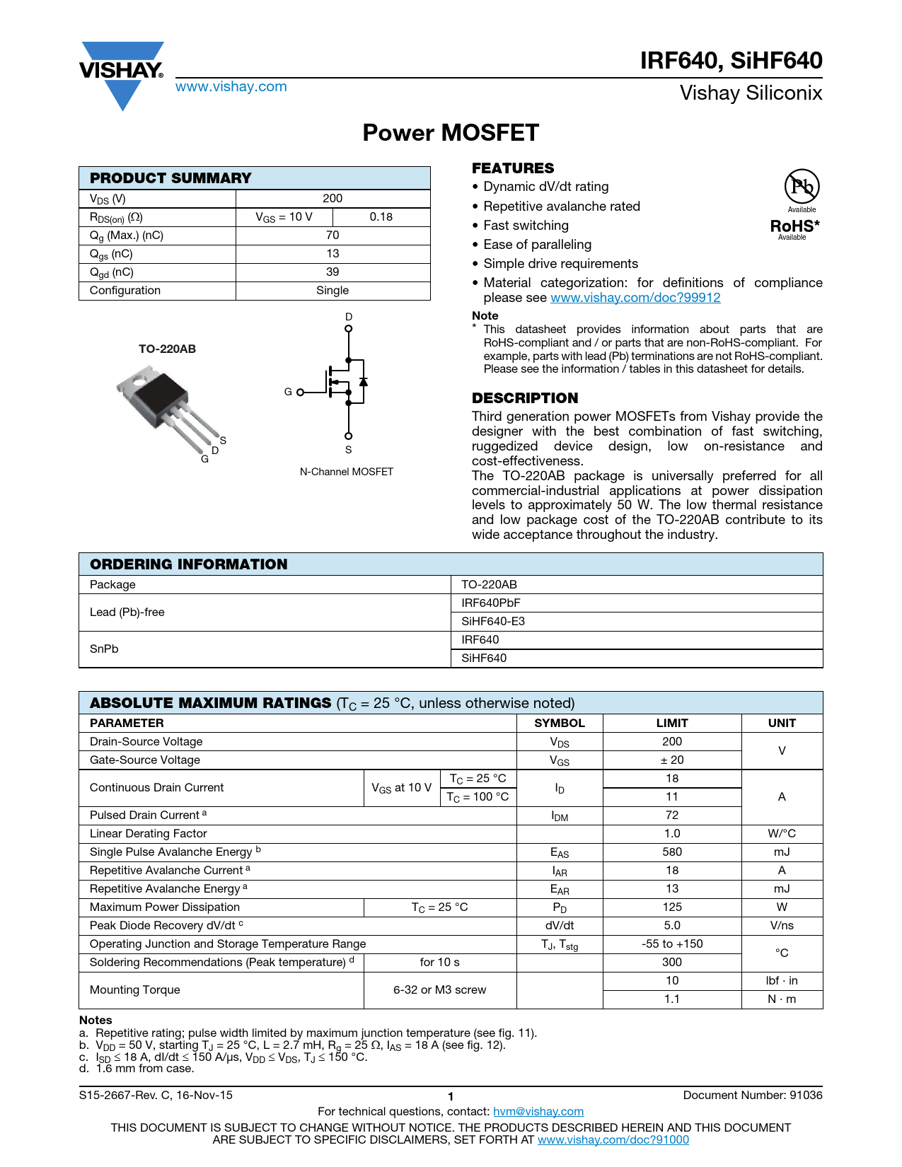IRF640, SiHF640. Power MOSFET. FEATURES. PRODUCT SUMMARY. Note. TO-220AB. DESCRIPTION. ORDERING INFORMATION. ABSOLUTE MAXIMUM RATINGS