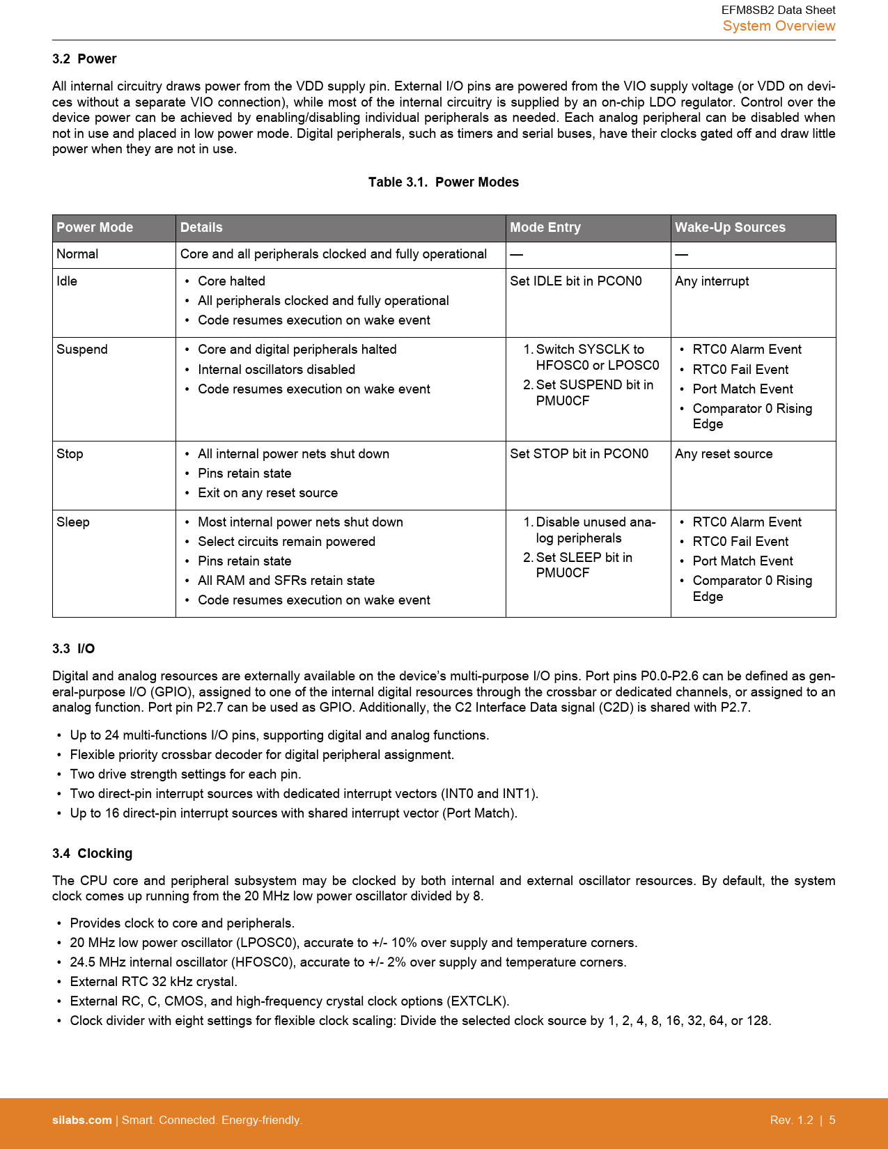 3.2 Power Table 3.1 Power Modes Power Mode Details Mode Entry Wake-Up Sources 3.3 I/O 3.4 Clocking silabs.com