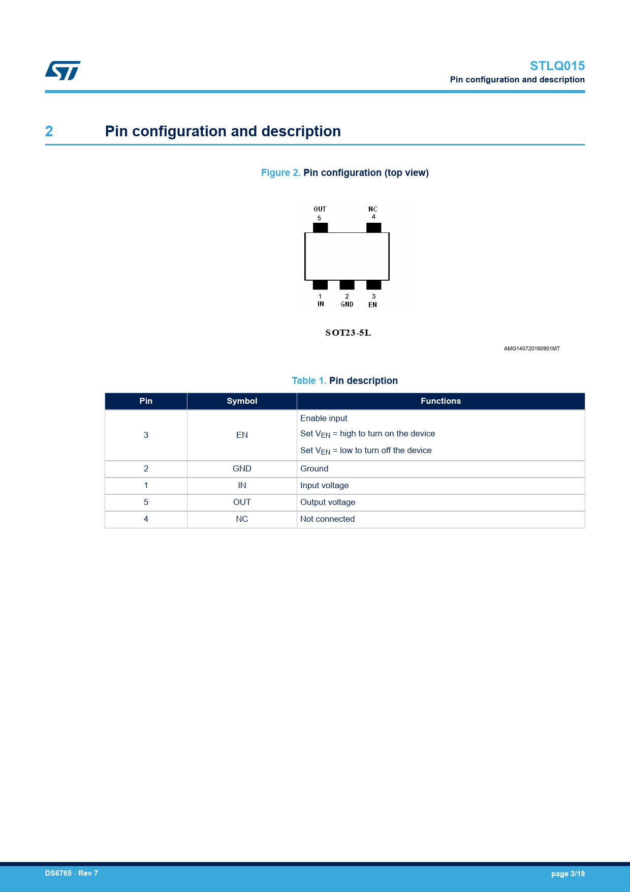 STLQ015Pin configuration and description2Pin configuration and descriptionFigure 2. Pin configuration (top view)S OT23-5L AMG140720160901MT Table 1. Pin descriptionPinSymbolFunctions Enable input 3 EN Set VEN = high to turn on the device Set VEN = low to turn off the device 2 GND Ground 1 IN Input voltage 5 OUT Output voltage 4 NC Not connected DS6765 - Rev 7page 3/19 Document Outline 1 Block diagram 2 Pin configuration and description 3 Typical application 4 Maximum ratings 5 Electrical characteristics 6 Typical performance characteristics 7 Package information 7.1 SOT23-5L mechanical data 7.2 SOT23-5L packing information 8 Ordering information Revision history Contents List of tables List of figures Disclaimer