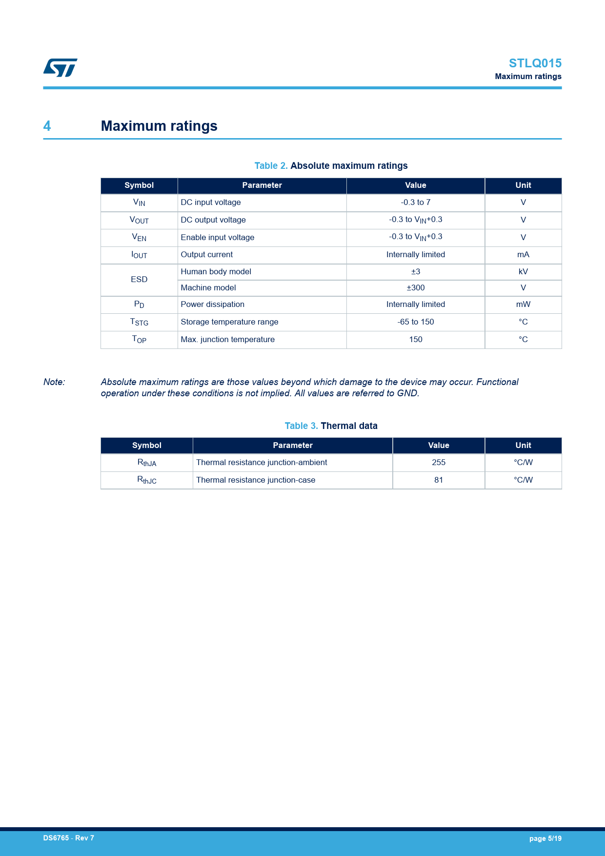 STLQ015 Maximum ratings Table 2 Absolute maximum ratings Symbol Parameter Value Unit Table 3 Thermal data DS6765 Rev 7