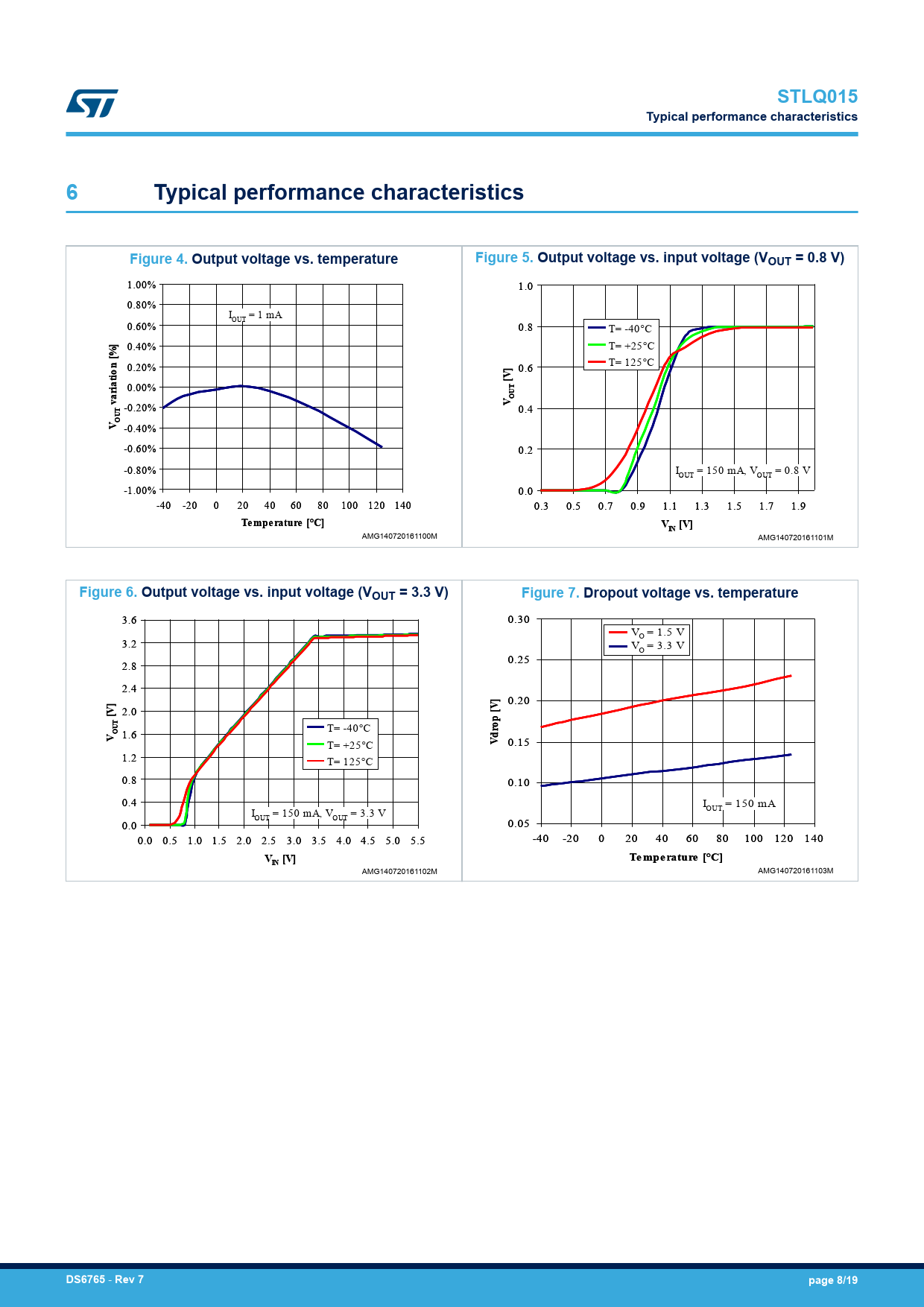 STLQ015Typical performance characteristics6Typical performance characteristicsFigure 4. Output voltage vs. temperatureFigure 5. Output voltage vs. input voltage (VOUT = 0.8 V) 1.00% % 1.0 0.80% % I = 1 mA OUT 0.60% % 0.8 T= -40°C ] 0.40% % T= +25°C [% n 0.20% % ] 0.6 T= 125°C 6 tio[Vria 0.00% % T UvaV OVT -0.20% 0.4 UV OV -0.40% -0.60% 0.2 -0.80% I = 150 mA, A V = 0.8 V OUT U OUT U -1.00% 0.0 -40 -20 0 20 40 60 80 100 120 140 0.3 0.5 0.7 0.9 1.1 1.3 1.5 1.7 1.9 TeT mpe rar turer [°C]CV [V]VINI AMG140720161100M AMG140720161101M Figure 6. Output voltage vs. input voltage (VOUT = 3.3 V)Figure 7. Dropout voltage vs. temperature 3.6 0.30 V = 1.5 V O 3.2 V = 3.3 V O 0.25 2.8 2.4 ]] 0.20 [V 2.0 [V pT U T= -40°C ro 1.6 V OVd T= +25°C V 0.15 1.2 T= 125°C 0.8 0.10 0.4 I = 150 mA I = 150 mA, A V = 3.3 V OUT OUT U OUT U 0.0 0.05 0.0 0.5 1.0 1.5 2.0 2.5 3.0 3.5 4.0 4.5 5.0 5.5 -40 -20 0 20 40 60 80 100 120 140 V [V[ ]VTeT mpe rar turer [°[ C]CINI AMG140720161102M AMG140720161103M DS6765 - Rev 7page 8/19 Document Outline 1 Block diagram 2 Pin configuration and description 3 Typical application 4 Maximum ratings 5 Electrical characteristics 6 Typical performance characteristics 7 Package information 7.1 SOT23-5L mechanical data 7.2 SOT23-5L packing information 8 Ordering information Revision history Contents List of tables List of figures Disclaimer