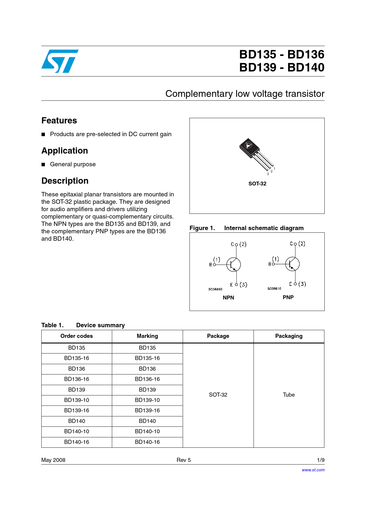 BD135 - BD136 BD139 - BD140 Complementary low voltage transistor Features ■ Products are pre-selected in DC current gain Application ■ General purpose 1 2 3 DescriptionSOT-32 These epitaxial planar transistors are mounted in the SOT-32 plastic package. They are designed for audio amplifiers and drivers utilizing complementary or quasi-complementary circuits. The NPN types are the BD135 and BD139, and Figure 1.Internal schematic diagram the complementary PNP types are the BD136 and BD140. NPNPNPTable 1.Device summaryOrder codesMarkingPackagePackaging BD135 BD135 BD135-16 BD135-16 BD136 BD136 BD136-16 BD136-16 BD139 BD139 SOT-32 Tube BD139-10 BD139-10 BD139-16 BD139-16 BD140 BD140 BD140-10 BD140-10 BD140-16 BD140-16 May 2008 Rev 5 1/9 www.st.com 9 Document Outline Figure 1. Internal schematic diagram Table 1. Device summary 1 Electrical ratings Table 2. Absolute maximum ratings Table 3. Thermal data 2 Electrical characteristics Table 4. On/off states 2.1 Electrical characteristics (curves) Figure 2. Safe operating area Figure 3. Derating 3 Package mechanical data 4 Revision history Table 5. Document revision history