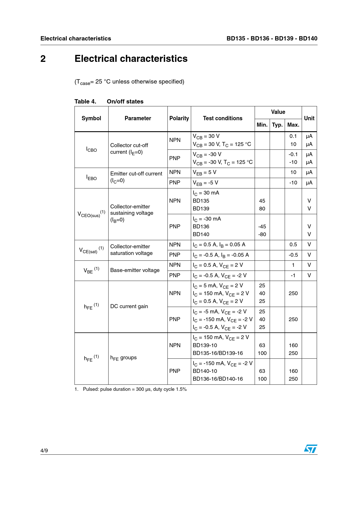 Electrical characteristicsBD135 - BD136 - BD139 - BD1402 Electricalcharacteristics (Tcase= 25 °C unless otherwise specified) Table 4.On/off statesValueSymbolParameterPolarityTest conditionsUnitMin. Typ. Max. V 0.1 µA NPN CB = 30 V Collector cut-off VCB = 30 V, TC = 125 °C 10 µA ICBO current (IE=0) V -0.1 µA PNP CB = -30 V VCB = -30 V, TC = 125 °C -10 µA Emitter cut-off current NPN VEB = 5 V 10 µA IEBO (IC=0) PNP VEB = -5 V -10 µA IC = 30 mA NPN BD135 45 V Collector-emitter BD139 80 V V (1) sustaining voltage CEO(sus) (I I B=0) C = -30 mA PNP BD136 -45 V BD140 -80 V NPN IC = 0.5 A, IB = 0.05 A 0.5 V V (1) Collector-emitter CE(sat) saturation voltage PNP IC = -0.5 A, IB = -0.05 A -0.5 V NPN IC = 0.5 A, VCE = 2 V 1 V V (1) BE Base-emitter voltage PNP IC = -0.5 A, VCE = -2 V -1 V IC = 5 mA, VCE = 2 V 25 NPN IC = 150 mA, VCE = 2 V 40 250 IC = 0.5 A, VCE = 2 V 25 h (1) FE DC current gain IC = -5 mA, VCE = -2 V 25 PNP IC = -150 mA, VCE = -2 V 40 250 IC = -0.5 A, VCE = -2 V 25 IC = 150 mA, VCE = 2 V NPN BD139-10 63 160 BD135-16/BD139-16 100 250 h (1) h FE FE groups IC = -150 mA, VCE = -2 V PNP BD140-10 63 160 BD136-16/BD140-16 100 250 1. Pulsed: pulse duration = 300 µs, duty cycle 1.5% 4/9 Document Outline Figure 1. Internal schematic diagram Table 1. Device summary 1 Electrical ratings Table 2. Absolute maximum ratings Table 3. Thermal data 2 Electrical characteristics Table 4. On/off states 2.1 Electrical characteristics (curves) Figure 2. Safe operating area Figure 3. Derating 3 Package mechanical data 4 Revision history Table 5. Document revision history