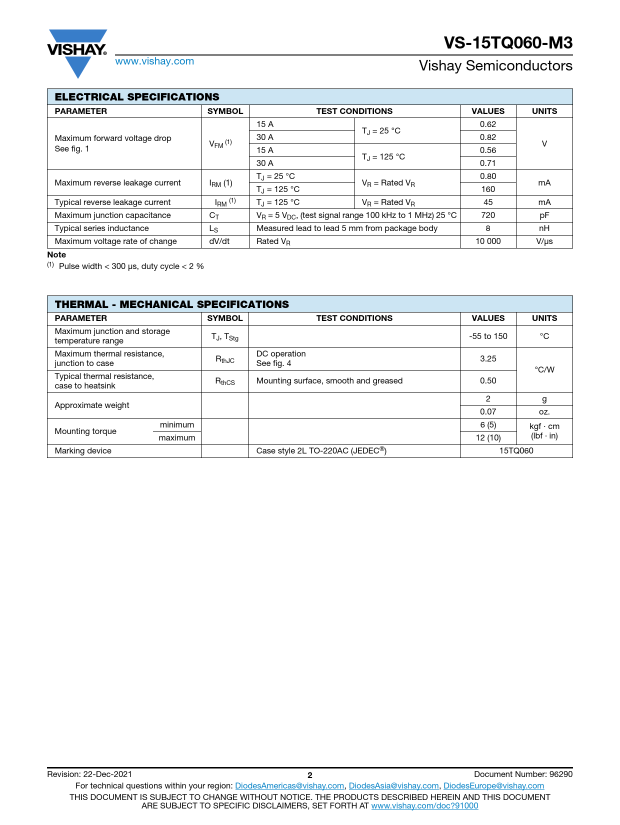 VS-15TQ060-M3. ELECTRICAL SPECIFICATIONS PARAMETER. SYMBOL. TEST CONDITIONS. VALUES. UNITS. Note
