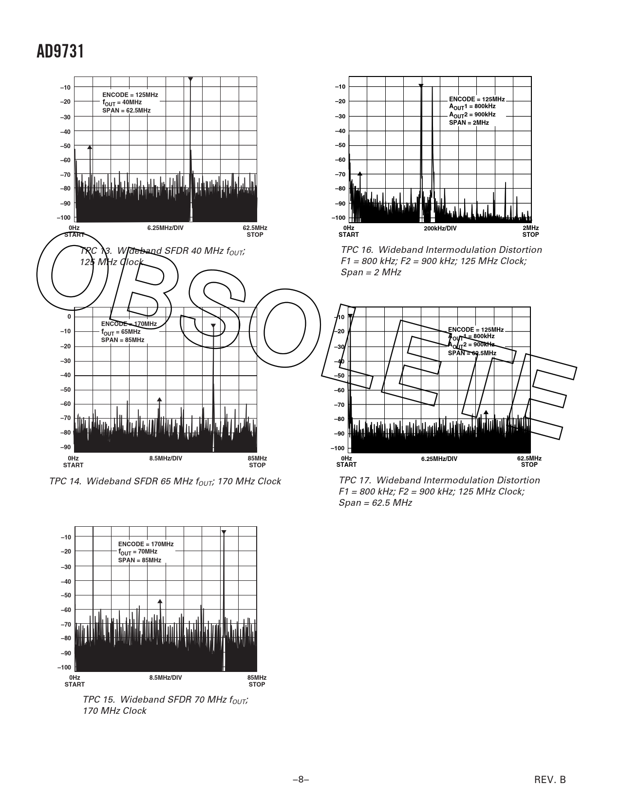 TPC 14. Wideband SFDR 65 MHz f TPC 17. Wideband Intermodulation Distortion OUT; 170 MHz Clock F1 = 800 kHz; F2 = 900 kHz; 125 MHz Clock; Span = 62.5 MHz