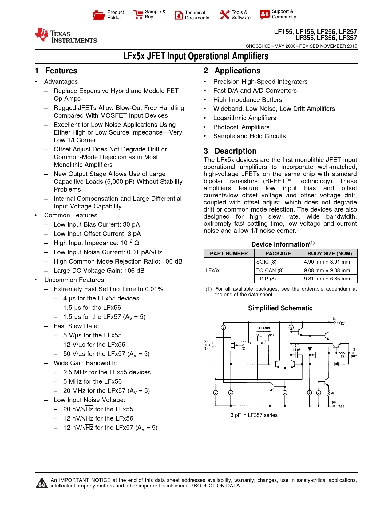 link to page 35 link to page 35 link to page 35 link to page 35 link to page 35 link to page 1 Product Sample & Technical Tools & Support & Folder Buy Documents Software Community LF155, LF156, LF256, LF257LF355, LF356, LF357 SNOSBH0D – MAY 2000 – REVISED NOVEMBER 2015 LFx5x JFET Input Operational Amplifiers1 Features2 Applications • Advantages • Precision High-Speed Integrators 1 – Replace Expensive Hybrid and Module FET • Fast D/A and A/D Converters Op Amps • High Impedance Buffers – Rugged JFETs Allow Blow-Out Free Handling • Wideband, Low Noise, Low Drift Amplifiers Compared With MOSFET Input Devices • Logarithmic Amplifiers – Excellent for Low Noise Applications Using • Photocell Amplifiers Either High or Low Source Impedance—Very • Sample and Hold Circuits Low 1/f Corner – Offset Adjust Does Not Degrade Drift or 3 Description Common-Mode Rejection as in Most The LFx5x devices are the first monolithic JFET input Monolithic Amplifiers operational amplifiers to incorporate well-matched, – New Output Stage Allows Use of Large high-voltage JFETs on the same chip with standard Capacitive Loads (5,000 pF) Without Stability bipolar transistors (BI-FET™ Technology). These Problems amplifiers feature low input bias and offset currents/low offset voltage and offset voltage drift, – Internal Compensation and Large Differential coupled with offset adjust, which does not degrade Input Voltage Capability drift or common-mode rejection. The devices are also • Common Features designed for high slew rate, wide bandwidth, – Low Input Bias Current: 30 pA extremely fast settling time, low voltage and current noise and a low 1/f noise corner. – Low Input Offset Current: 3 pA – High Input Impedance: 1012 Ω Device Information(1) – Low Input Noise Current: 0.01 pA/√Hz PART NUMBERPACKAGEBODY SIZE (NOM) – High Common-Mode Rejection Ratio: 100 dB SOIC (8) 4.90 mm × 3.91 mm – Large DC Voltage Gain: 106 dB LFx5x TO-CAN (8) 9.08 mm × 9.08 mm PDIP (8) 9.81 mm × 6.35 mm • Uncommon Features – Extremely Fast Settling Time to 0.01%: (1) For all available packages, see the orderable addendum at the end of the data sheet. – 4 μs for the LFx55 devices – 1.5 μs for the LFx56 Simplified Schematic – 1.5 μs for the LFx57 (AV = 5) – Fast Slew Rate: – 5 V/µs for the LFx55 – 12 V/µs for the LFx56 – 50 V/µs for the LFx57 (AV = 5) – Wide Gain Bandwidth: – 2.5 MHz for the LFx55 devices – 5 MHz for the LFx56 – 20 MHz for the LFx57 (AV = 5) – Low Input Noise Voltage: – 20 nV/√Hz for the LFx55 3 pF in LF357 series – 12 nV/√Hz for the LFx56 – 12 nV/√Hz for the LFx57 (AV = 5) 1 An IMPORTANT NOTICE at the end of this data sheet addresses availability, warranty, changes, use in safety-critical applications, intellectual property matters and other important disclaimers. PRODUCTION DATA. Document Outline 1 Features 2 Applications 3 Description Table of Contents 4 Revision History 5 Pin Configuration and Functions 6 Specifications 6.1 Absolute Maximum Ratings 6.2 ESD Ratings 6.3 Recommended Operating Conditions 6.4 Thermal Information 6.5 AC Electrical Characteristics, TA = TJ = 25°C, VS = ±15 V 6.6 DC Electrical Characteristics, TA = TJ = 25°C, VS = ±15 V 6.7 DC Electrical Characteristics 6.8 Power Dissipation Ratings 6.9 Typical Characteristics 6.9.1 Typical DC Performance Characteristics 6.9.2 Typical AC Performance Characteristics 7 Detailed Description 7.1 Overview 7.2 Functional Block Diagram 7.3 Feature Description 7.3.1 Large Differential Input Voltage 7.3.2 Large Common-Mode Input Voltage 7.4 Device Functional Modes 8 Application and Implementation 8.1 Application Information 8.2 Typical Application 8.2.1 Design Requirements 8.2.2 Detailed Design Procedure 8.2.3 Application Curves 8.3 System Examples 9 Power Supply Recommendations 10 Layout 10.1 Layout Guidelines 10.1.1 Printed-Circuit-Board Layout For High-Impedance Work 10.2 Layout Example 11 Device and Documentation Support 11.1 Related Links 11.2 Community Resources 11.3 Trademarks 11.4 Electrostatic Discharge Caution 11.5 Glossary 12 Mechanical, Packaging, and Orderable Information