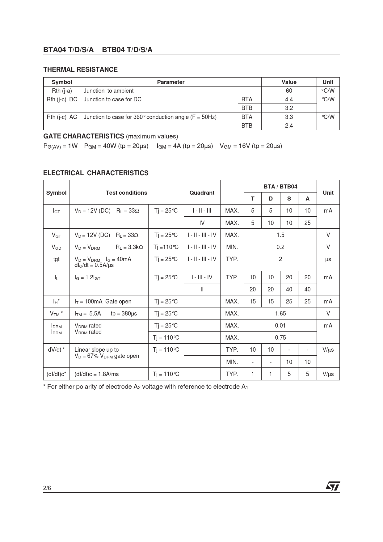 BTA04 T/D/S/A BTB04 T/D/S/A. THERMAL RESISTANCE. Symbol. Parameter. Value. Unit. GATE CHARACTERISTICS. ELECTRICAL CHARACTERISTICS