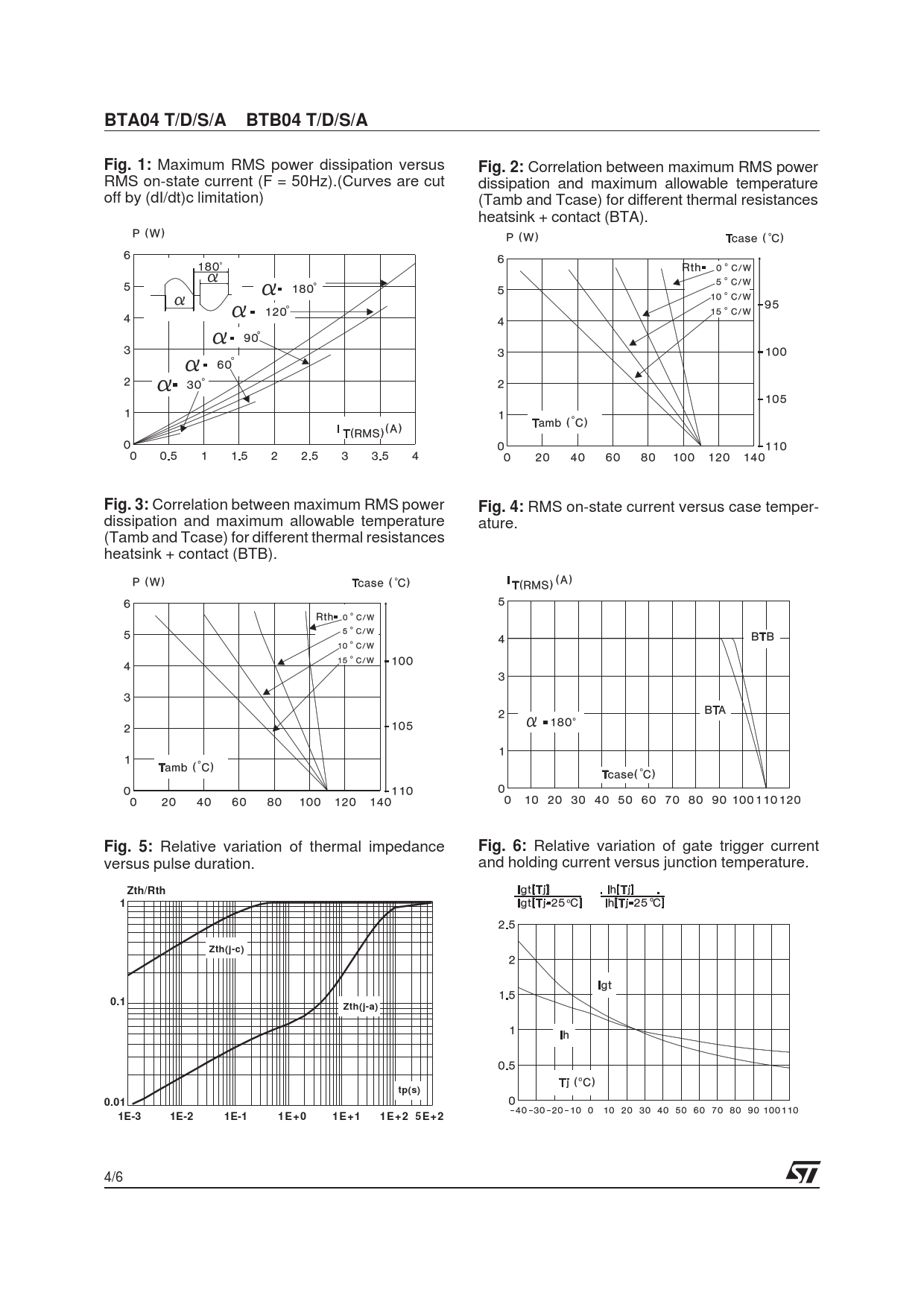 BTA04 T/D/S/A BTB04 T/D/S/A. Fig. 1:. Fig. 2:. Fig. 3:. Fig. 4:. Fig. 5:. Fig. 6:. Zth/Rth. Zth(j-c). 0.1. Zth(j-a). tp(s). 0.01. 1E-3. 1E-2. 1E-1