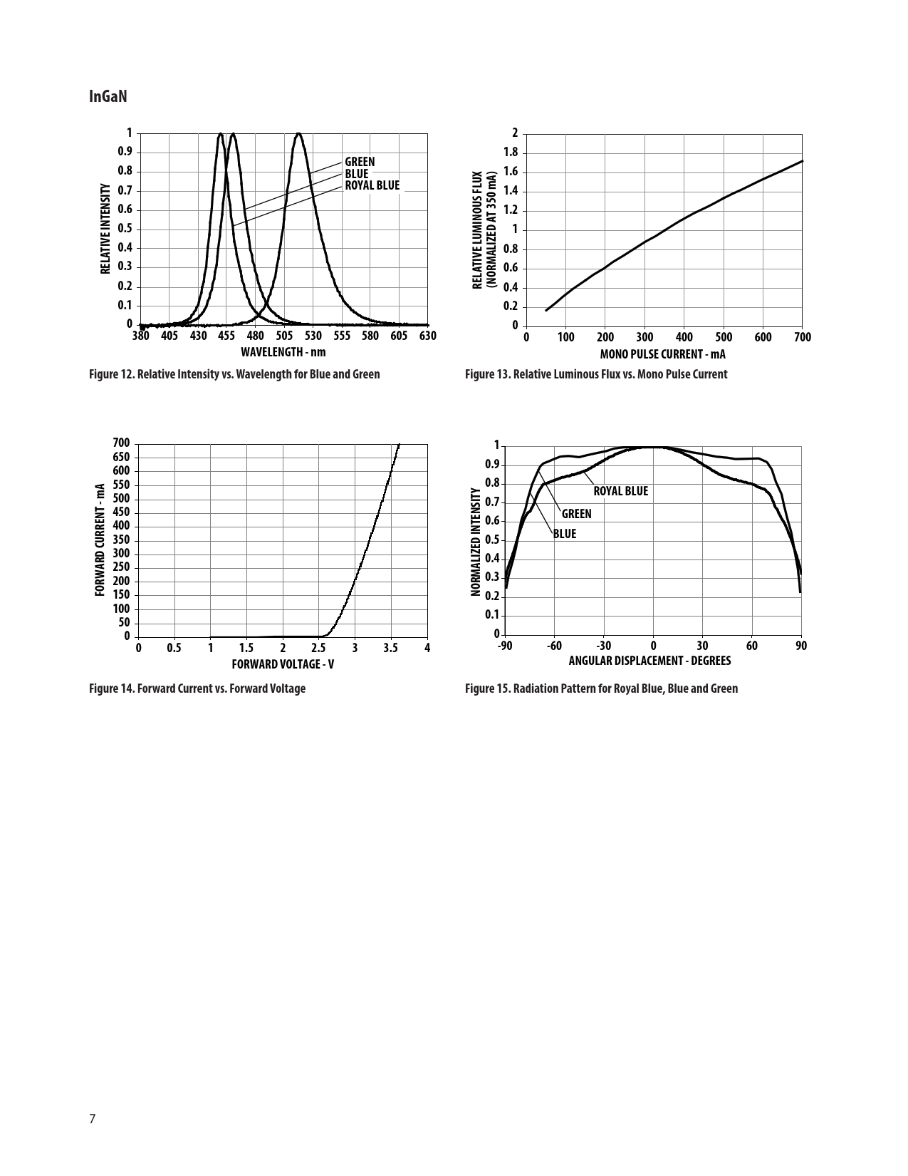 InGaN120.91.8GREEN0.8BLUE1.60.7ROYAL BLUE1.40.61.20.510.40.80.3RELATIVE INTENSITY0.60.2RELATIVE LUMINOUS FLUX (NORMALIZED AT 350 mA) 0.40.10.200380 405 430 455 480 505 530 555 580 605 6300100200300400500600700WAVELENGTH - nmMONO PULSE CURRENT - mAFigure 12. Relative Intensity vs. Wavelength for Blue and GreenFigure 13. Relative Luminous Flux vs. Mono Pulse Current70016506000.95500.8500ROYAL BLUE0.7450GREEN4000.63500.5BLUE3000.42502000.3FORWARD CURRENT - mA 150NORMALIZED INTENSITY 0.2100500.10000.511.522.533.54-90-60-300306090FORWARD VOLTAGE - VANGULAR DISPLACEMENT - DEGREESFigure 14. Forward Current vs. Forward VoltageFigure 15. Radiation Pattern for Royal Blue, Blue and Green 7