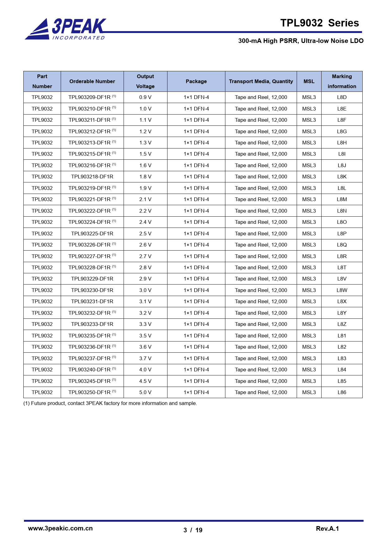 TPL9032 TPL903209-DF1R (1) 0.9 V 1×1 DFN-4 Tape and Reel, 12,000 MSL3 L8D TPL9032 TPL903210-DF1R (1) 1.0 V 1×1 DFN-4 Tape and Reel, 12,000 MSL3 L8E TPL9032 TPL903211-DF1R (1) 1.1 V 1×1 DFN-4 Tape and Reel, 12,000 MSL3 L8F TPL9032 TPL903212-DF1R (1) 1.2 V 1×1 DFN-4 Tape and Reel, 12,000 MSL3 L8G TPL9032 TPL903213-DF1R (1) 1.3 V 1×1 DFN-4 Tape and Reel, 12,000 MSL3 L8H TPL9032 TPL903215-DF1R (1) 1.5 V 1×1 DFN-4 Tape and Reel, 12,000 MSL3 L8I TPL9032 TPL903216-DF1R (1) 1.6 V 1×1 DFN-4 Tape and Reel, 12,000 MSL3 L8J TPL9032 TPL903218-DF1R 1.8 V 1×1 DFN-4 Tape and Reel, 12,000 MSL3 L8K TPL9032 TPL903219-DF1R (1) 1.9 V 1×1 DFN-4 Tape and Reel, 12,000 MSL3 L8L TPL9032 TPL903221-DF1R (1) 2.1 V 1×1 DFN-4 Tape and Reel, 12,000 MSL3 L8M TPL9032 TPL903222-DF1R (1) 2.2 V 1×1 DFN-4 Tape and Reel, 12,000 MSL3 L8N TPL9032 TPL903224-DF1R (1) 2.4 V 1×1 DFN-4 Tape and Reel, 12,000 MSL3 L8O TPL9032 TPL903225-DF1R 2.5 V 1×1 DFN-4 Tape and Reel, 12,000 MSL3 L8P TPL9032 TPL903226-DF1R (1) 2.6 V 1×1 DFN-4 Tape and Reel, 12,000 MSL3 L8Q TPL9032 TPL903227-DF1R (1) 2.7 V 1×1 DFN-4 Tape and Reel, 12,000 MSL3 L8R TPL9032 TPL903228-DF1R (1) 2.8 V 1×1 DFN-4 Tape and Reel, 12,000 MSL3 L8T TPL9032 TPL903229-DF1R 2.9 V 1×1 DFN-4 Tape and Reel, 12,000 MSL3 L8V TPL9032 TPL903230-DF1R 3.0 V 1×1 DFN-4 Tape and Reel, 12,000 MSL3 L8W TPL9032 TPL903231-DF1R 3.1 V 1×1 DFN-4 Tape and Reel, 12,000 MSL3 L8X TPL9032 TPL903232-DF1R (1) 3.2 V 1×1 DFN-4 Tape and Reel, 12,000 MSL3 L8Y TPL9032 TPL903233-DF1R 3.3 V 1×1 DFN-4 Tape and Reel, 12,000 MSL3 L8Z TPL9032 TPL903235-DF1R (1) 3.5 V 1×1 DFN-4 Tape and Reel, 12,000 MSL3 L81 TPL9032 TPL903236-DF1R (1) 3.6 V 1×1 DFN-4 Tape and Reel, 12,000 MSL3 L82 TPL9032 TPL903237-DF1R (1) 3.7 V 1×1 DFN-4 Tape and Reel, 12,000 MSL3 L83 TPL9032 TPL903240-DF1R (1) 4.0 V 1×1 DFN-4 Tape and Reel, 12,000 MSL3 L84 TPL9032 TPL903245-DF1R (1) 4.5 V 1×1 DFN-4 Tape and Reel, 12,000 MSL3 L85 TPL9032 TPL903250-DF1R (1) 5.0 V 1×1 DFN-4 Tape and Reel, 12,000 MSL3 L86 (1) Future product, contact 3PEAK factory for more information and sample.
