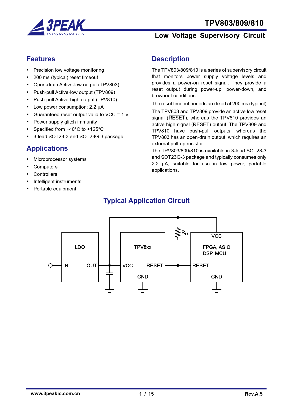 TPV803/809/810Low Voltage Supervisory CircuitFeaturesDescription Precision low voltage monitoring The TPV803/809/810 is a series of supervisory circuit 200 ms (typical) reset timeout that monitors power supply voltage levels and Open-drain Active-low output (TPV803) provides a power-on reset signal. They provide a reset output during power-up, power-down, and Push-pull Active-low output (TPV809) brownout conditions. Push-pull Active-high output (TPV810) The reset timeout periods are fixed at 200 ms (typical). Low power consumption: 2.2 μA The TPV803 and TPV809 provide an active low reset Guaranteed reset output valid to VCC = 1 V signal (RESET ), whereas the TPV810 provides an Power supply glitch immunity active high signal (RESET) output. The TPV809 and Specified from −40°C to +125°C TPV810 have push-pull outputs, whereas the 3-lead SOT23-3 and SOT23G-3 package TPV803 has an open-drain output, which requires an external pull-up resistor. Applications The TPV803/809/810 is available in 3-lead SOT23-3 Microprocessor systems and SOT23G-3 package and typically consumes only 2.2 μA, suitable for use in low power, portable Computers applications. Controllers Intelligent instruments Portable equipment Typical Application Circuitwww.3peakic.com.cn1 / 15Rev.A.5