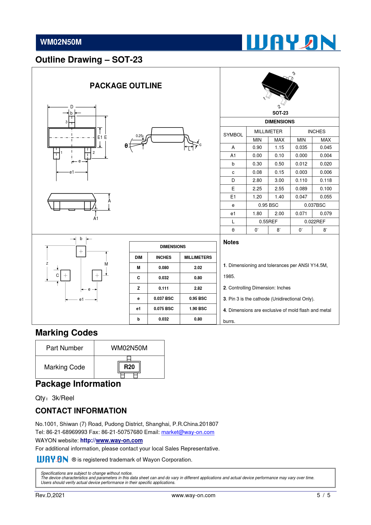 For additional information, please contact your local Sales Representative. ® is registered trademark of Wayon Corporation. Specifications are subject to change without notice. The device characteristics and parameters in this data sheet can and do vary in different applications and actual device performance may vary over time. Users should verify actual device performance in their specific applications. Rev.D,2021 www.way-on.com 5 / 5