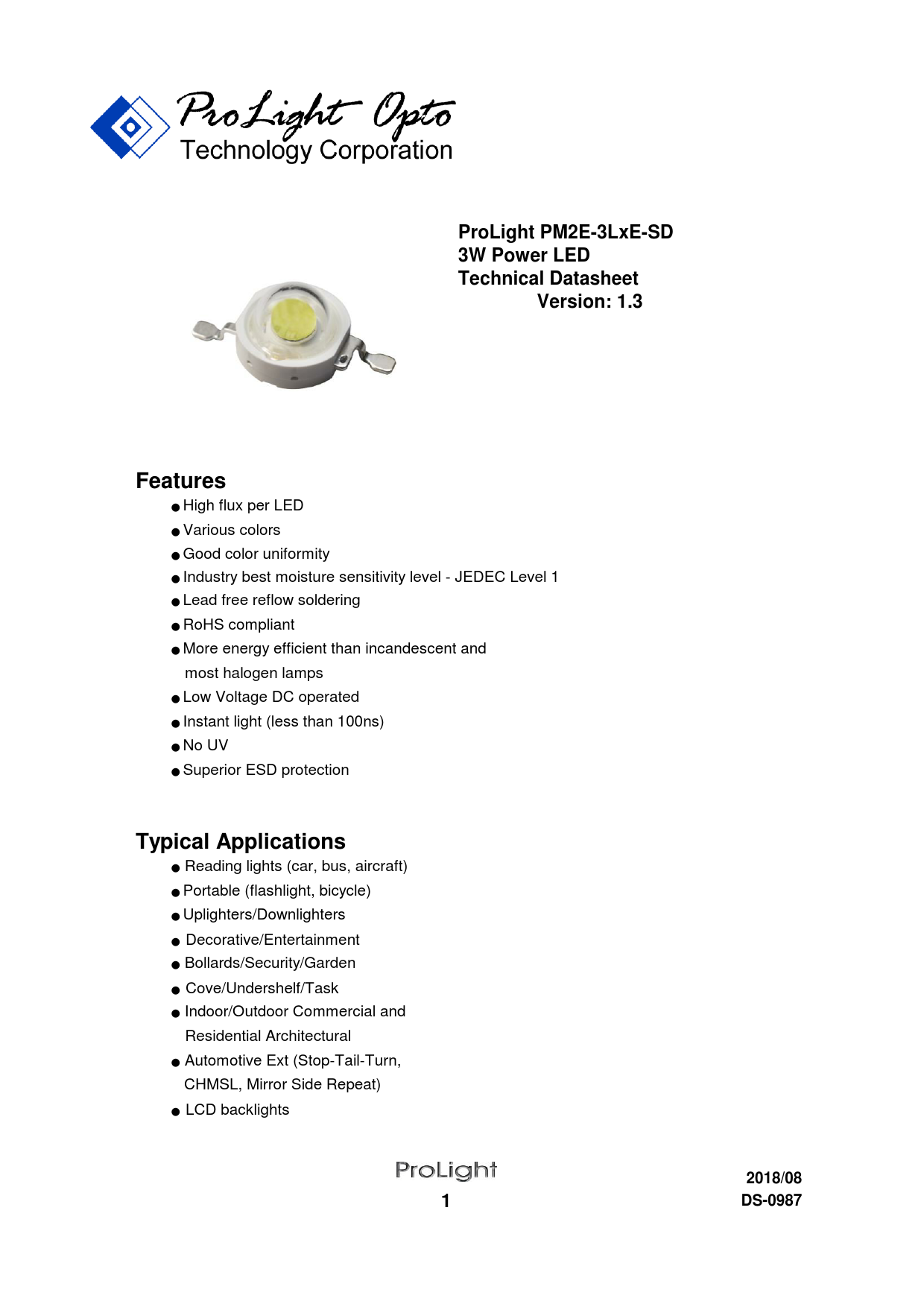 ProLight PM2E-3LxE-SD 3W Power LED Technical Datasheet. Version: 1.3. Features. Typical Applications. 2018/08. DS-0987