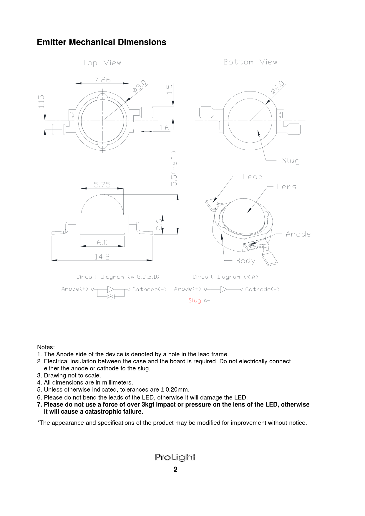 Notes: 1. The Anode side of the device is denoted by a hole in the lead frame. 2. Electrical insulation between the case and the board is required. Do not electrically connect either the anode or cathode to the slug. 3. Drawing not to scale. 4. All dimensions are in millimeters. 5. Unless otherwise indicated, tolerances are ± 0.20mm. 6. Please do not bend the leads of the LED, otherwise it will damage the LED.